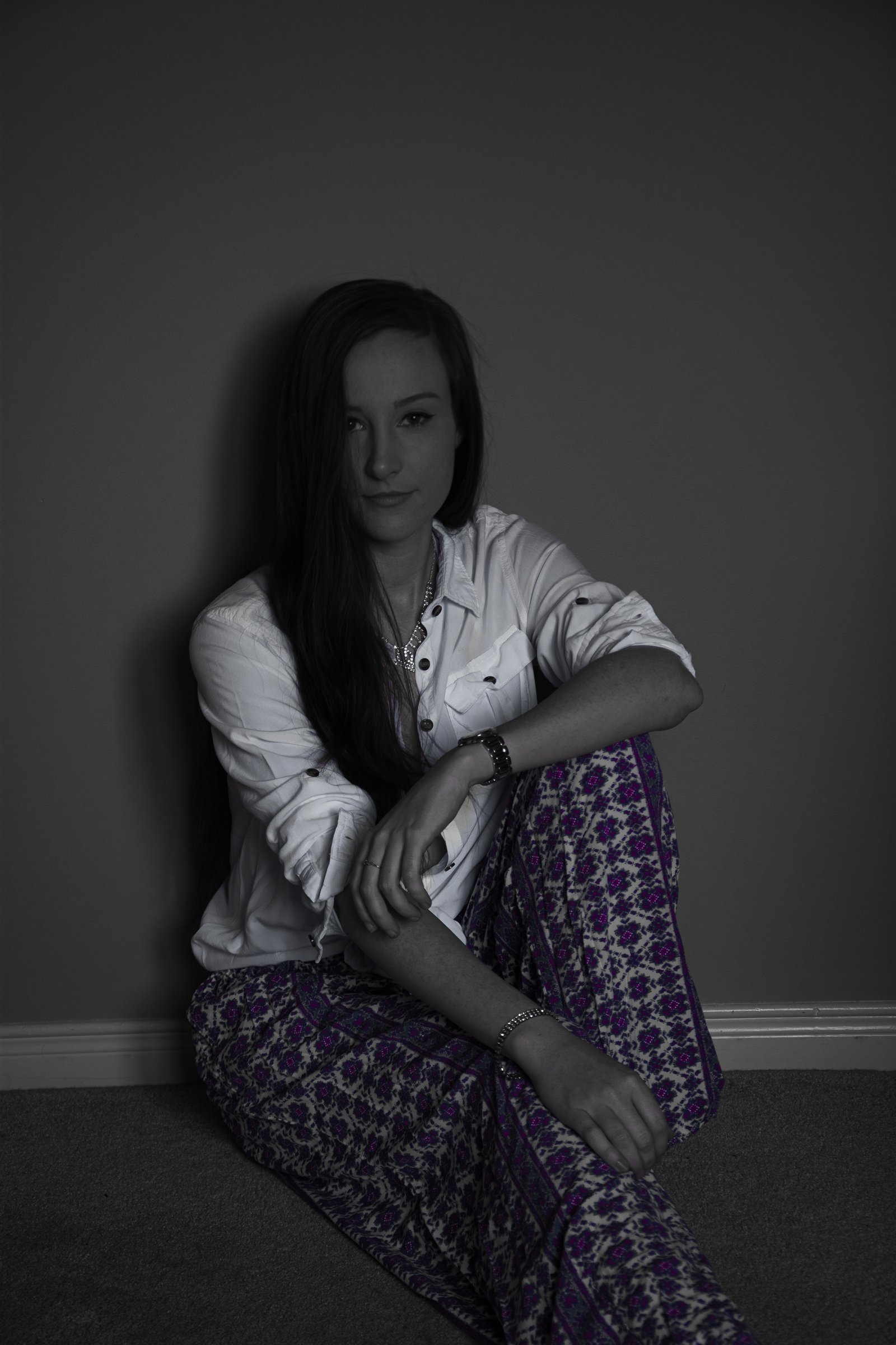 Selective desaturation selfie in a black-white-and-purple editing style.