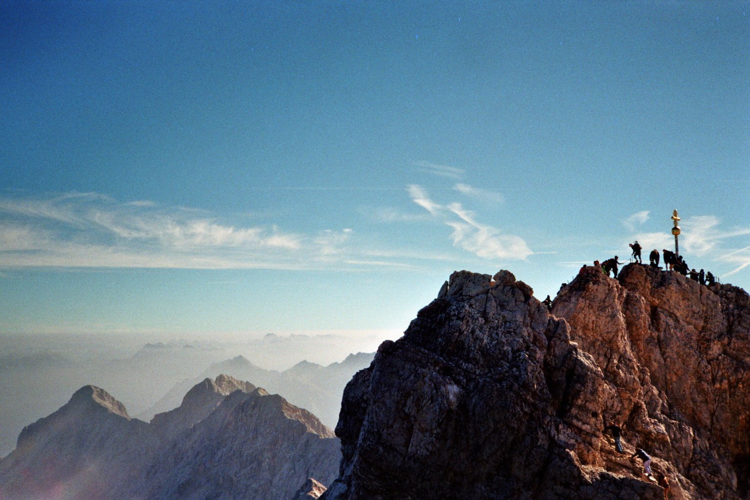 Ein Foto auf der Zugspitze von der Zugspitze und den Bergen im Hintergrund.