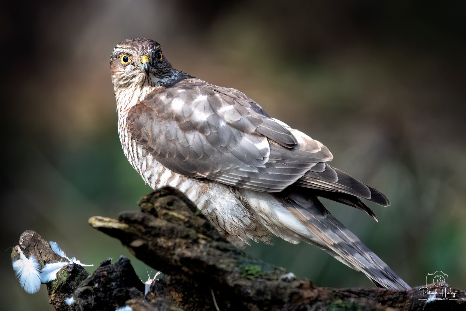 While eating a pigeon, this sparrowhawk keeps alert for other predators in the neighbourhood. This picture was taken in the forests next to the Dutch border in Kalmthout Belgium.