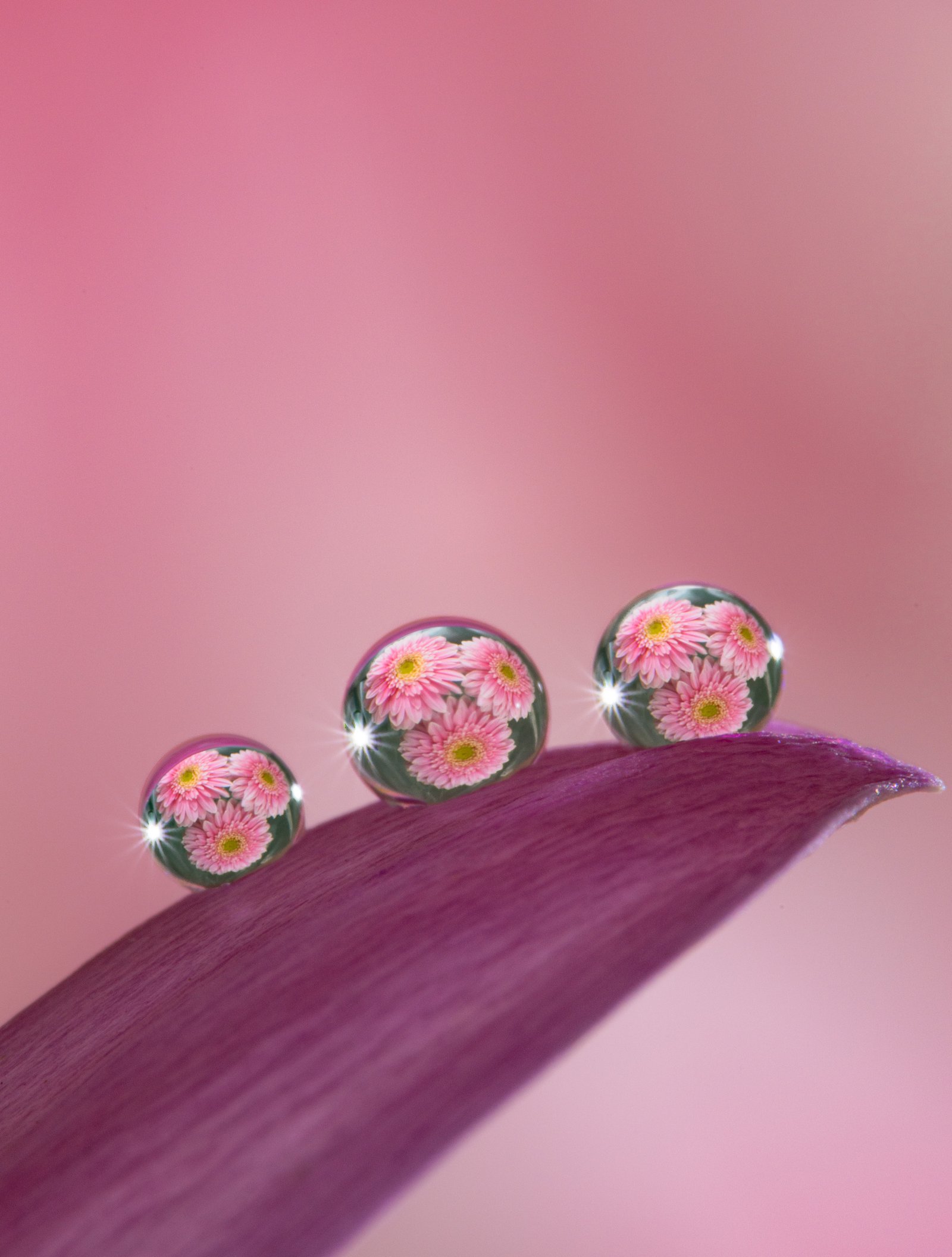 Placed tiny waterdrops accurately on a petal of a gerbera and captured other three gerberas in the waterdrops, which were located behind the waterdrops. The waterdrops were fleeting, but they were shining beautifully like jewels.