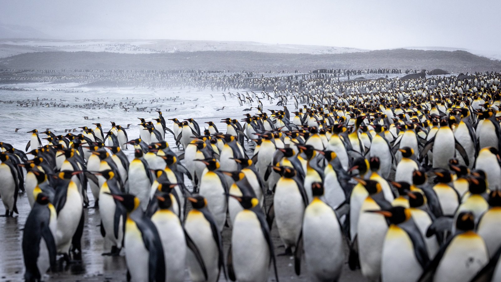This photograph captures the vast scale of a king penguin colony as they return from their feeding grounds in the frigid Southern Ocean. A deep depth of field emphasizes the sheer number of penguins stretching into the misty horizon, while a fast shutter speed freezes the motion of those emerging from the crashing waves. Their striking black, white, and golden plumage contrasts with the cold, muted tones of the landscape. These dedicated parents must navigate the crowded shore to reunite with their hungry chicks, relying on their calls to find them among thousands. The composition masterfully balances movement, texture, and atmosphere, highlighting the endurance and devotion of these remarkable seabirds.