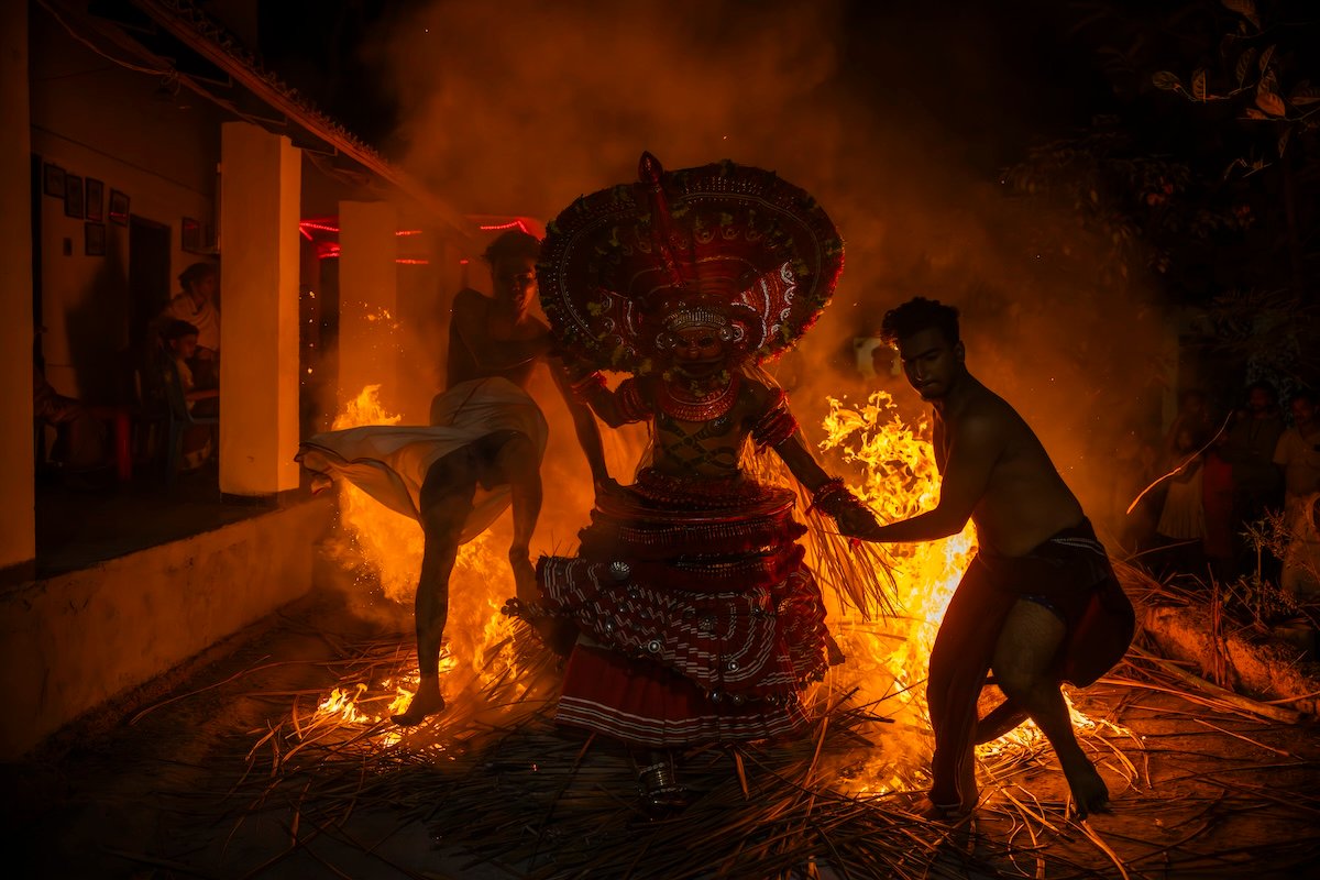 Theyyam is not just a ritual; it is the dissolving of self into the divine, where the human becomes the god, if only for a fleeting moment. It is a dance of transcendence, where the boundaries between mortal and immortal blur, reminding us that the sacred is not distant but alive, breathing within us. Theyyam is not performed—it is manifested, a living philosophy where devotion, tradition, and cosmic energy merge in an explosion of color, rhythm, and fire. It whispers the truth: divinity is not above us; it moves through us.