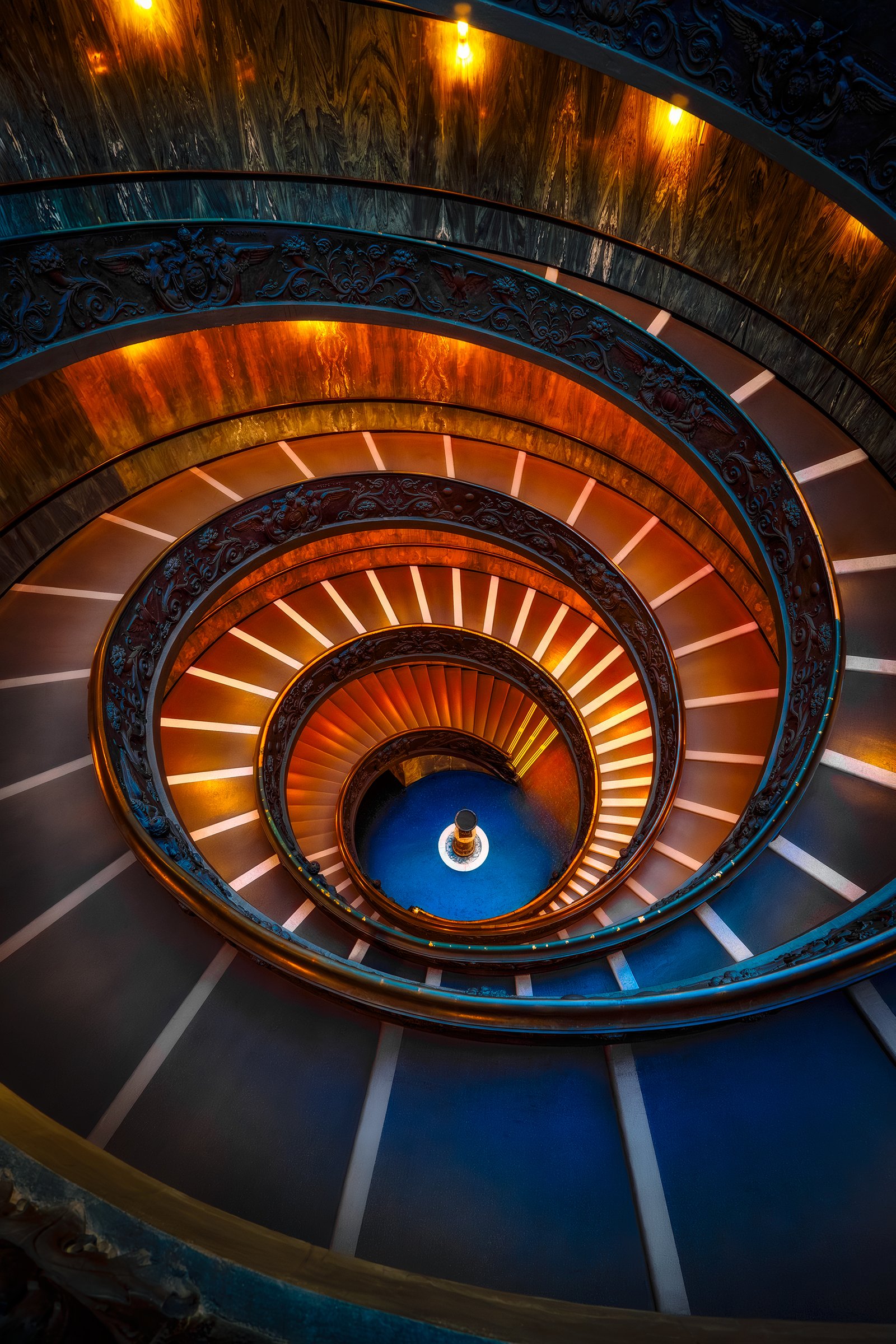 Beneath the Vatican's grandeur lies a descent into symmetry, motion, and light. This photograph captures the iconic spiral staircase not as a passageway but as a visual vortex—pulling the viewer into a realm where design becomes experience. The golden glow of artificial lights dances over the intricate bronze and marble, setting the stage for a timeless journey downward. The framing leads the eye inwards, like a gravitational pull. Every curve, every line is intentional. This is not a staircase—it is a helix of history, of power, of sacred geometry made tangible. The final glow at the center? A modern altar to form and function. This is where architecture becomes motion. And motion, memory.
