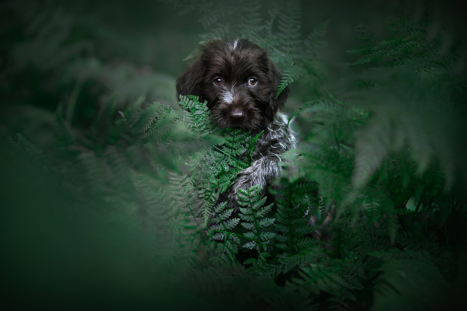 This photo captures the very first time this curious little puppy set paw in the forest. Surrounded by the quiet magic of nature, he discovered a whole new world full of scents, textures, and wonders — starting with a fern that quickly became his new favorite chew toy. His wide eyes and gentle curiosity reflect the pure joy of exploring something entirely new.