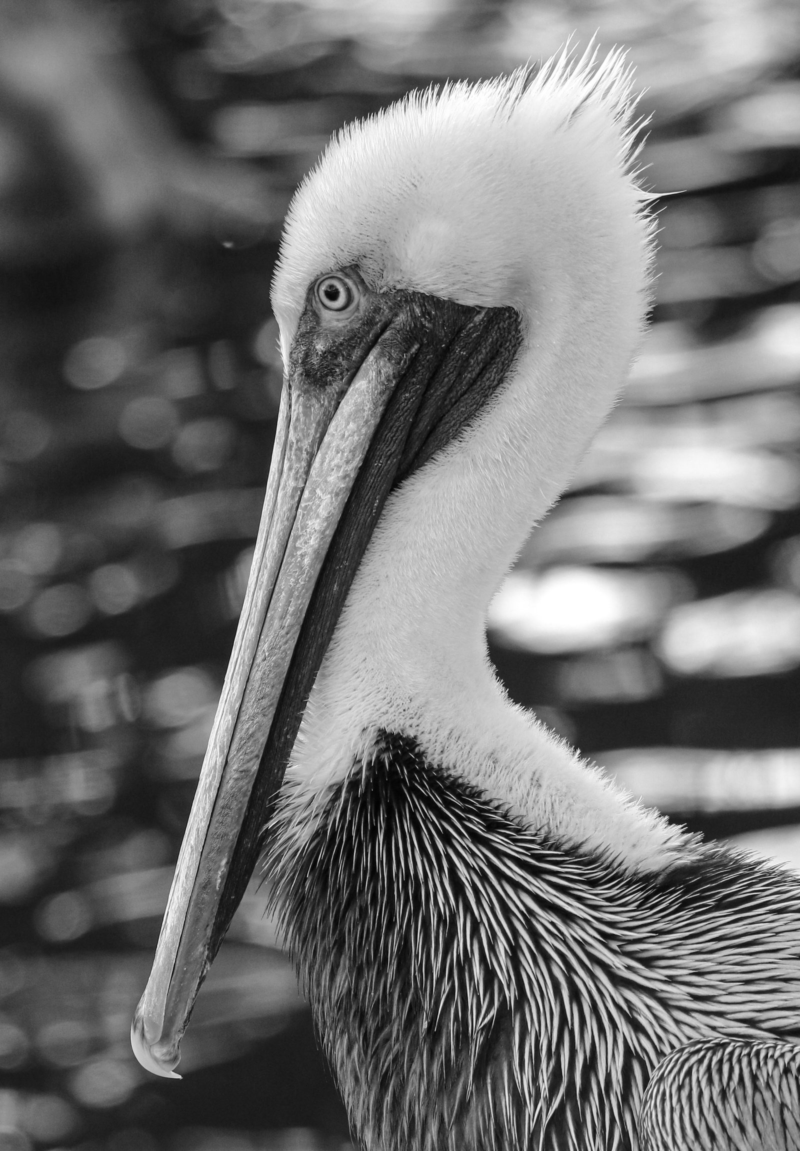 Portrait of a Brown Pelican, just having hopped out of the water. I love the mix of soft, fluffy neck feathers and the rougher main body plumage. Picture taken in Florida, 2020.