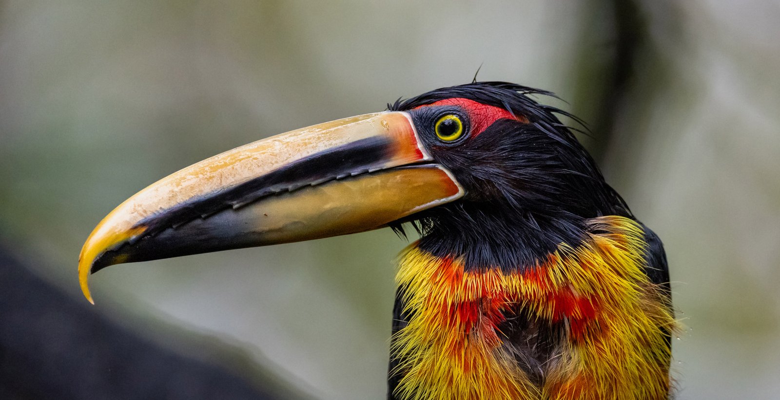 This pic features the wet hair look of a Pale-mandibled Araçari. I truly love the combo of the untypical front hook of the long beak, the strongly colored skin around the eyes and stark colors of the breast feathers. It was pouring cats and dogs on that day in Ecuador’s Cloud Forest. We discovered this Aracari at eye level, preening, and I was lucky to be close enough for this detailed shot.