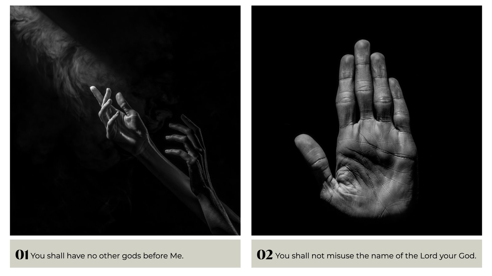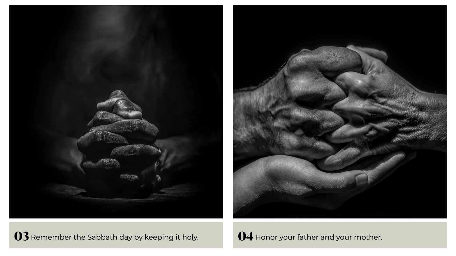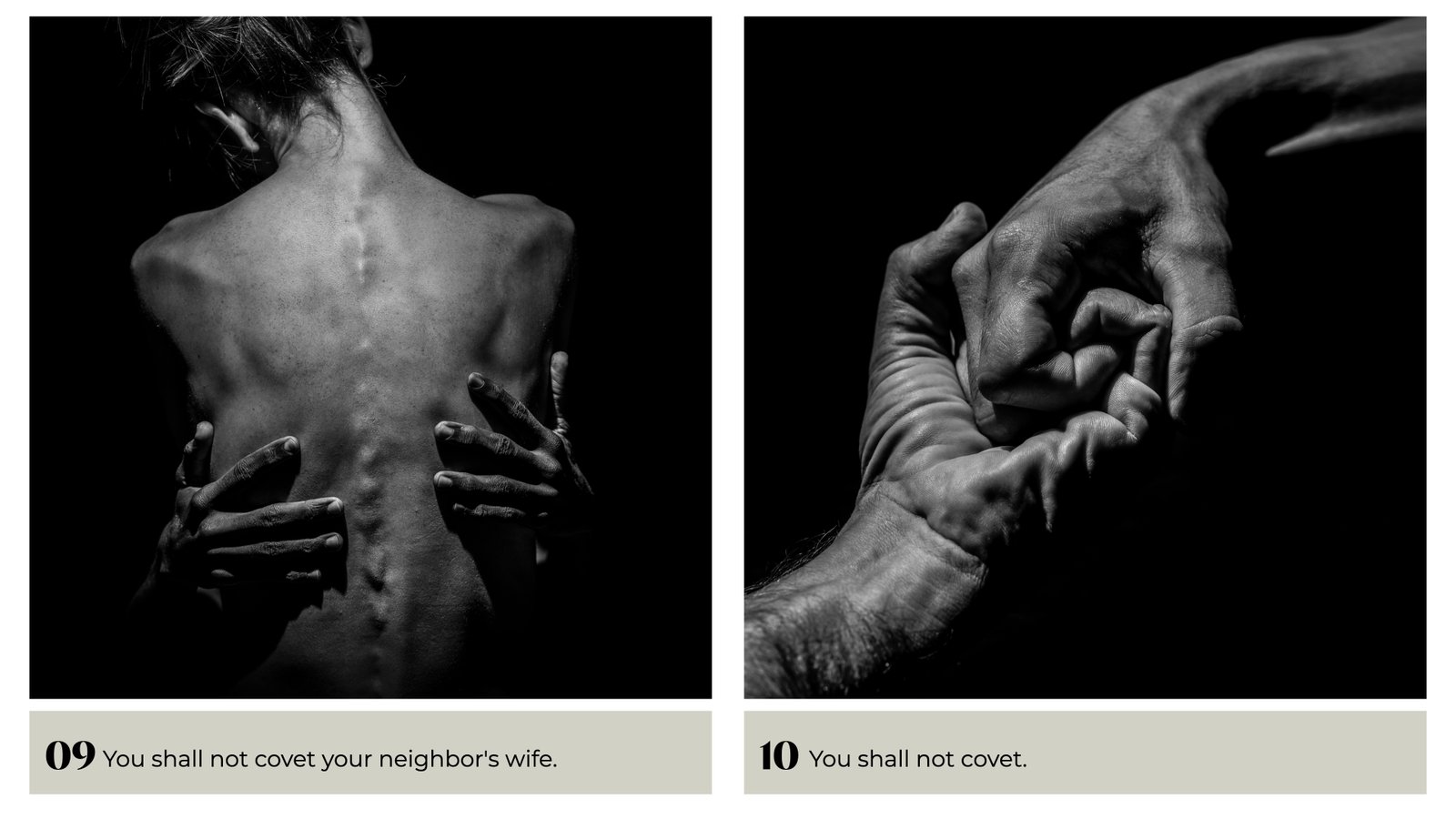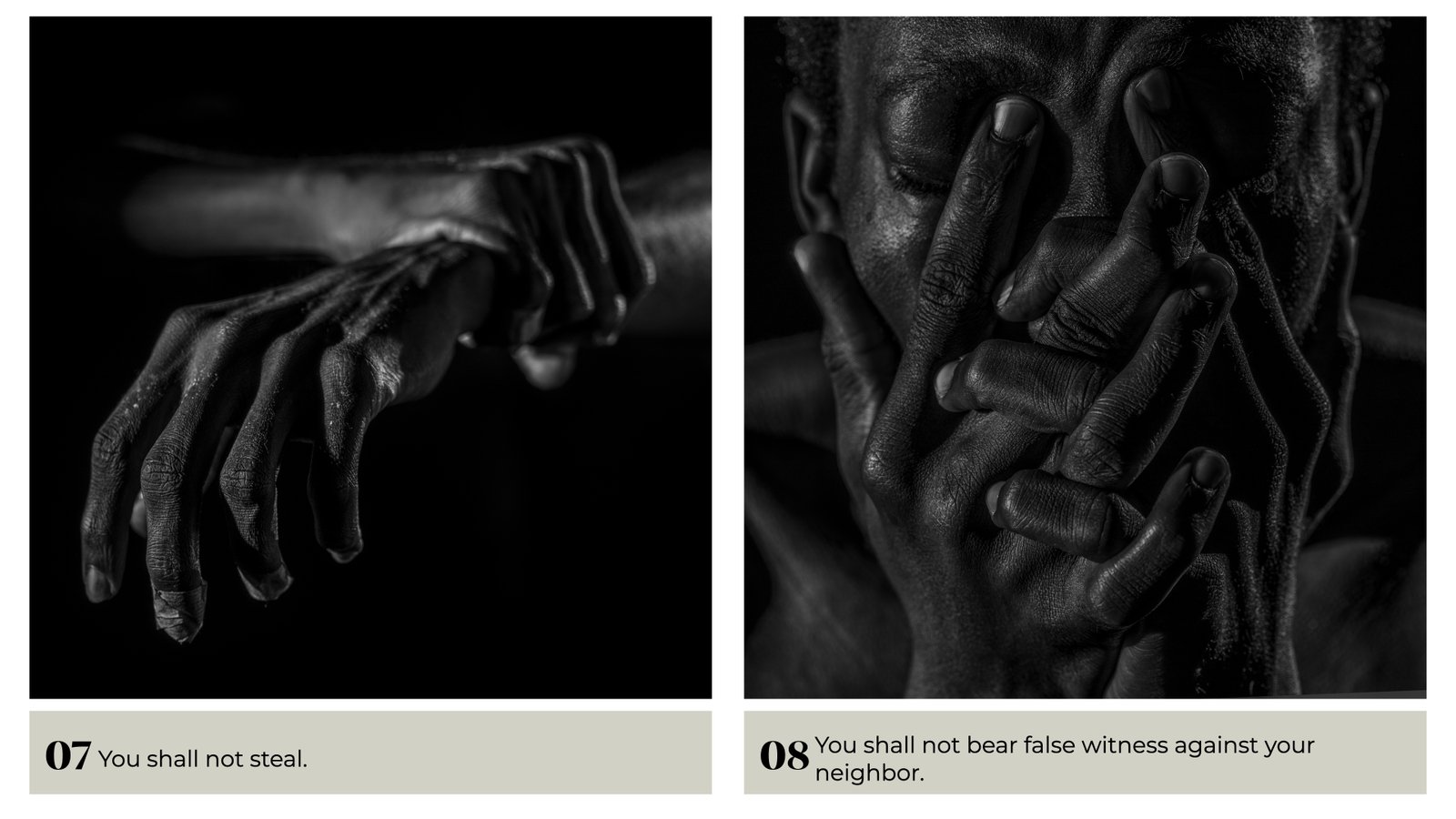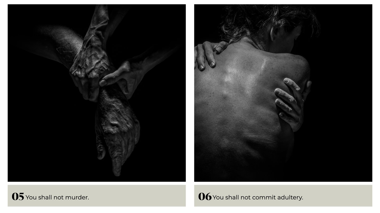 A profound exploration of God's principles through the poetic lens, lights and shadows of award winning photographer Fares Jammal. Each commandment is vividly brought to life using the expressive language and unique texture of human hands and bodies. The choice of black and white treatment, the delicate interplay of light and shadow invites viewers to reflect on the moral and ethical foundations they represent... the eternal struggle between good and bad... Jammal’s artistry transforms these ancient principles into powerful visual narratives, emphasizing their enduring relevance. Through this exhibition, Jammal not only honors the sacred text but also challenges us to see its commandments in a deep new perspective. “The imagery of intertwined hands can symbolize unity, support, and the interconnectedness of human relationships, which align with the principles of the commandments." says Fares Jammal.