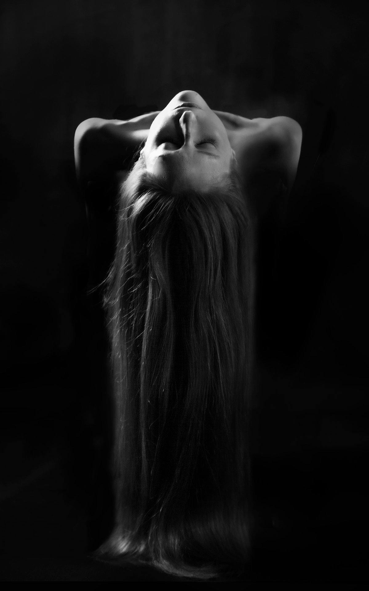 This photograph explores the fusion between the human form and the natural world. The female body, illuminated by light and shadow, takes on the verticality of a tree, while the long hair evokes roots symbolizing a deep connection with the earth. The black and white emphasizes the contrast between fragility and strength, celebrating the bond between humanity and nature.