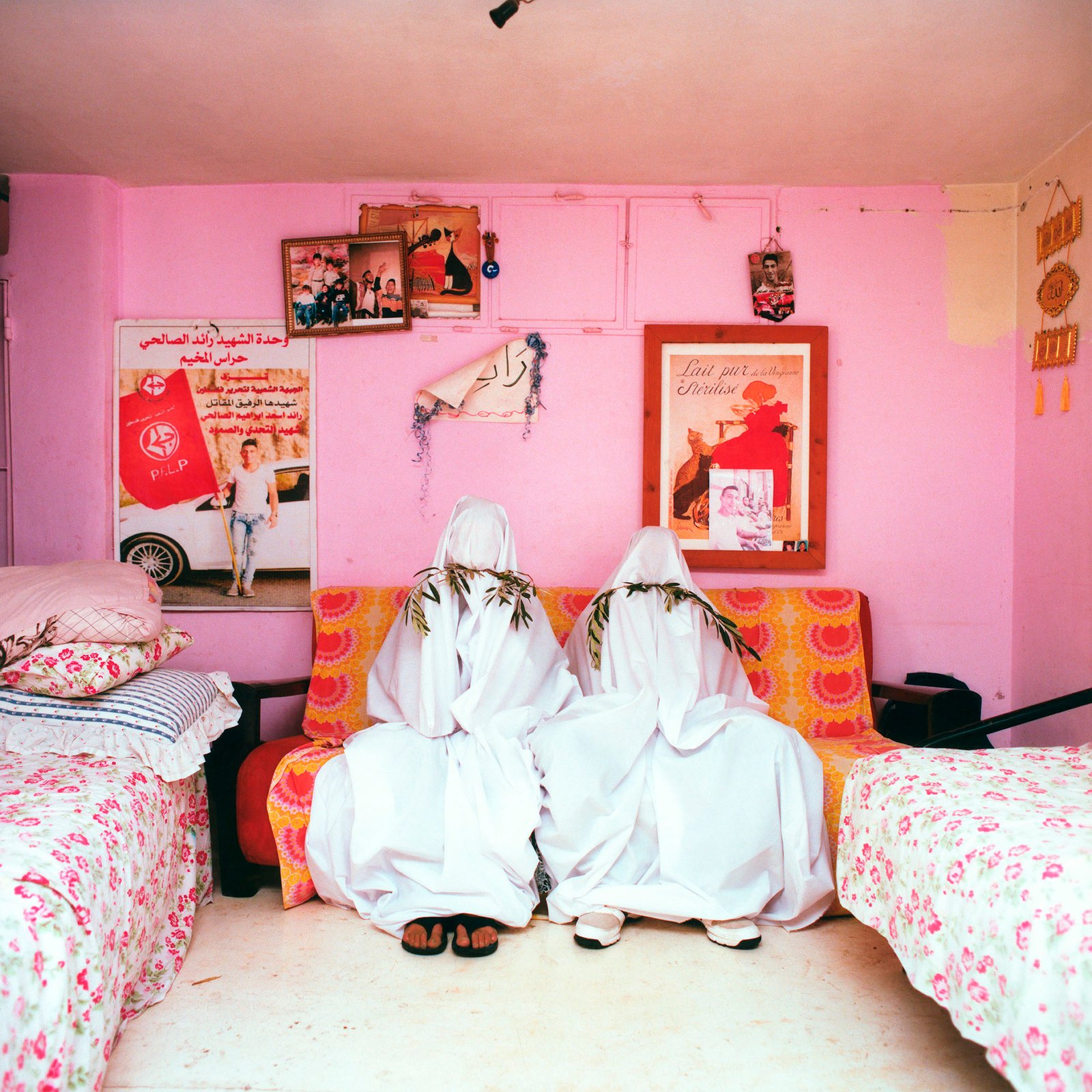 Love, a Title of Peace The picture shows two people, staged as peace doves, sitting on a living room sofa. It is the love story of a Palestinian woman and an Israeli man. They got to know each other in Jerusalem, the man converted to Islam to be able to marry her as a Muslim woman. He moved into the camp to be with her. For a long time the camp community suspected him to be an Israeli spy. One day, he was visiting Jerusalem at the time, she received a message that he had suddenly died.