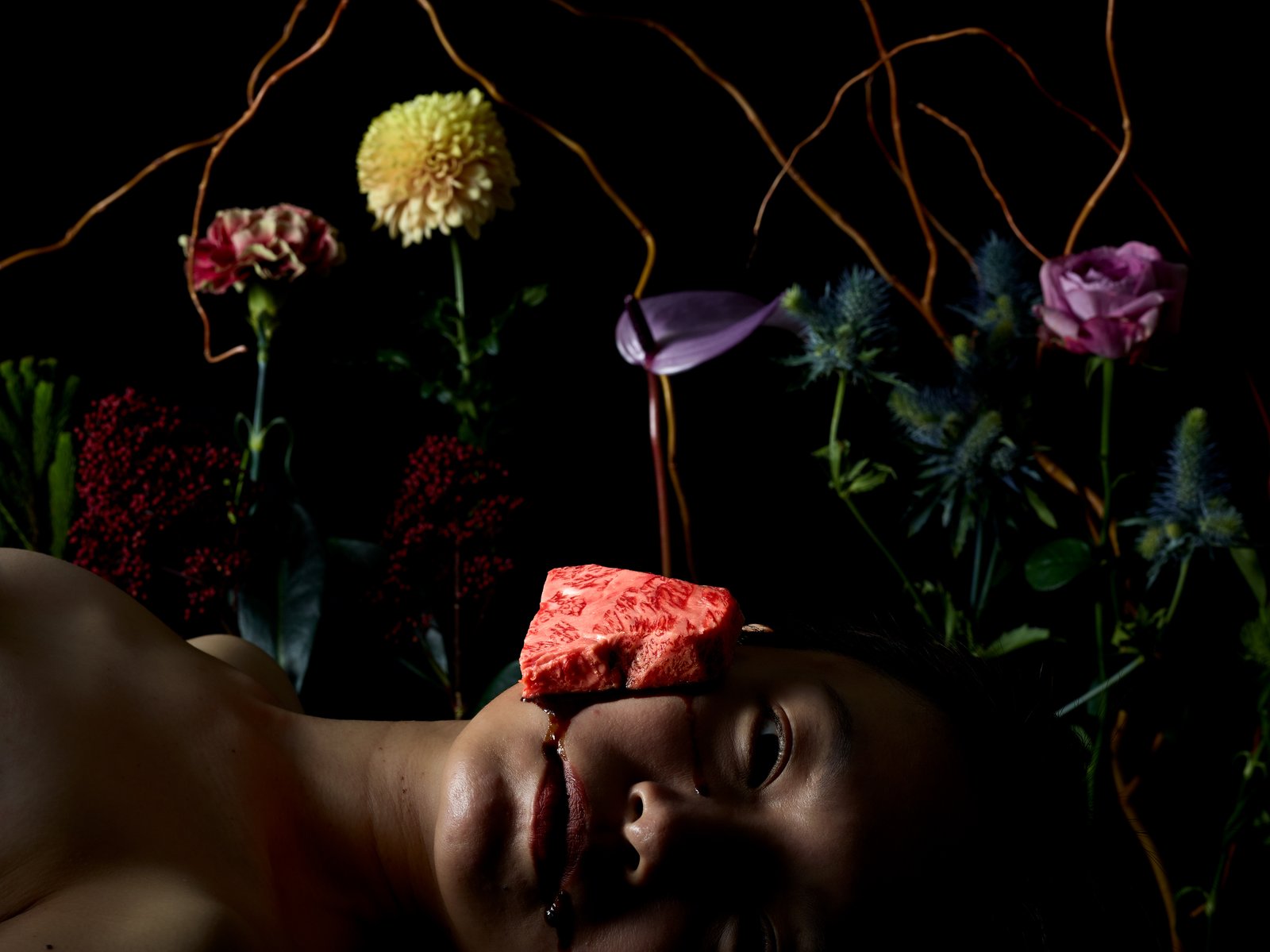 food is art This world is built on sacrifice. Humans eat animals such as cows, pigs, birds, and fish. This photo shows human flesh. I want to tell people to be thankful for food and not to waste it. *The meat in this photo is beef.