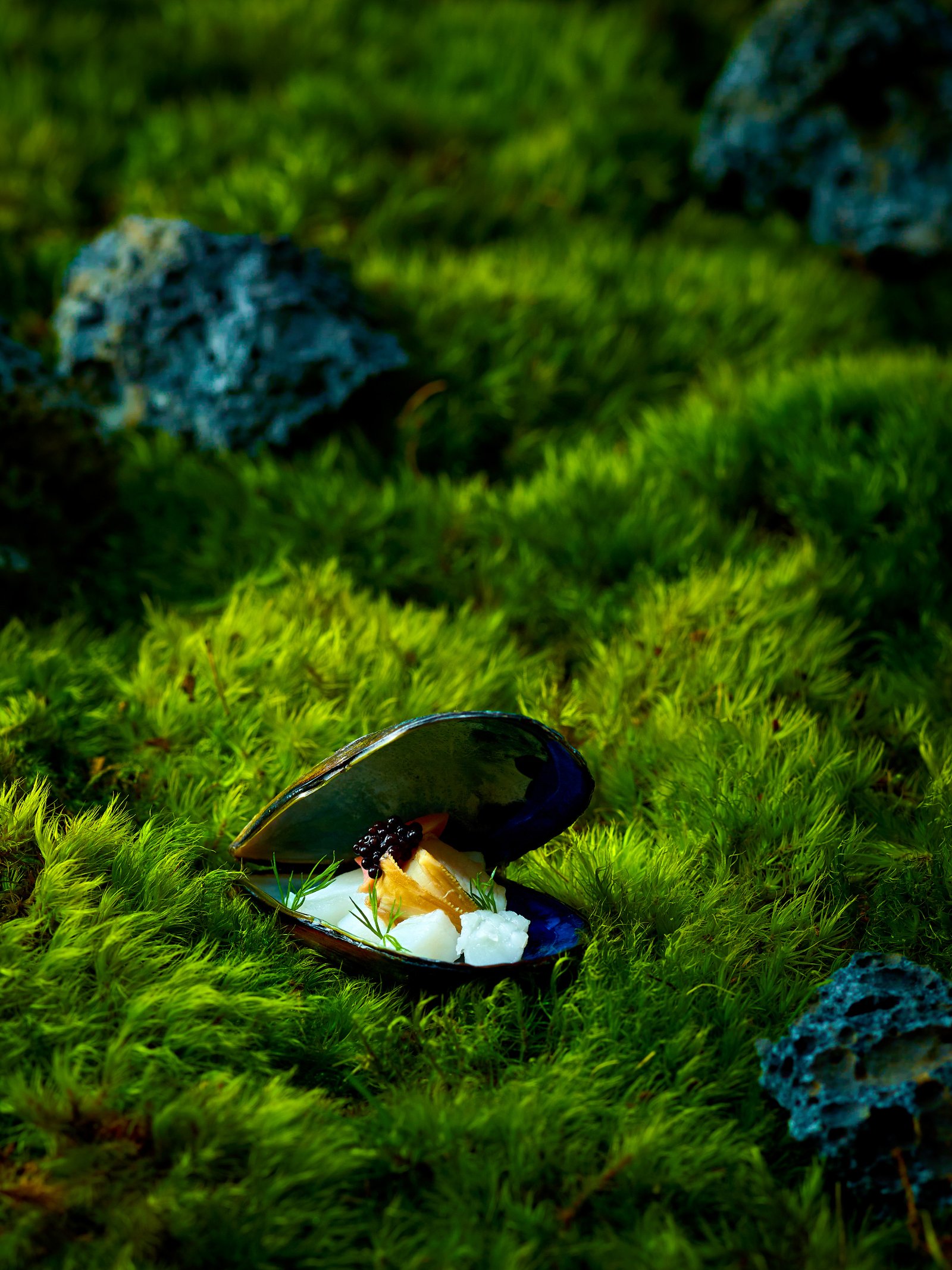 food is art To match the mysterious appearance of the shells, a mysterious forest is created to express another world.