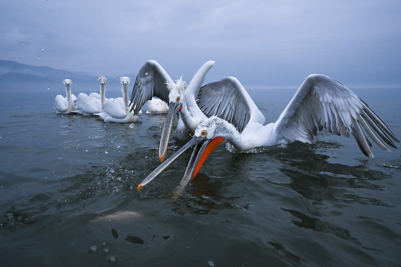Several Dalmatian pelicans are fishing in Lake Kerkini in northern Greece. With their beaks wide open, they dive into the water to catch fish.