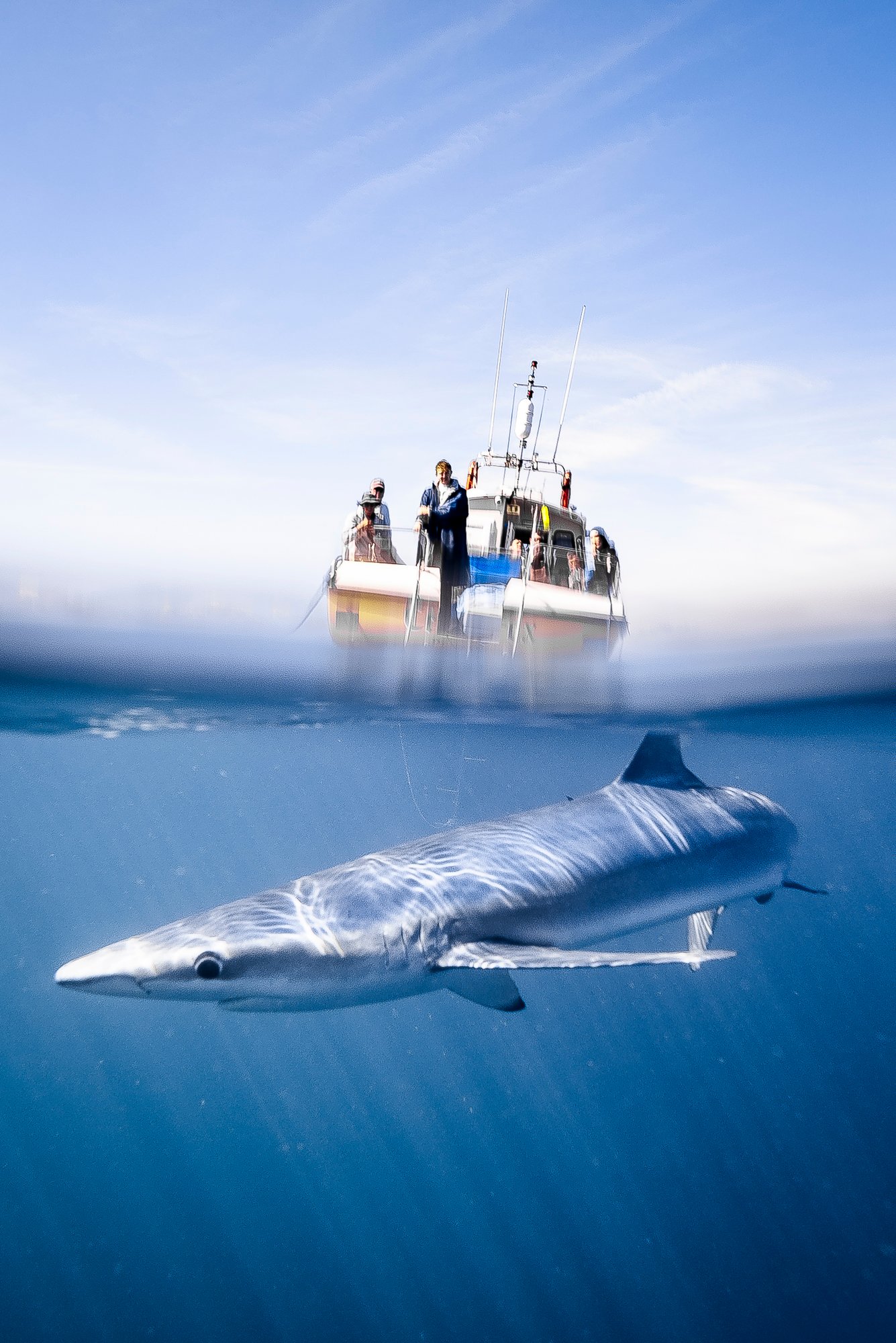 Working as a tourism guide with the blue sharks in Cornwall, UK I never tire of seeing how beautiful and graceful these animals are as they effortlessly glide through the water. It is a privilege to share this experience with people. But it is rare that the sun is out, the sharks are at the surface and the water is still enough to chance a split shot with the boat in the background. Some people get as much from watching the sharks on the boat as they do immersed in the water with them, yet I find it a completely different experience and I think this photo touches upon that.