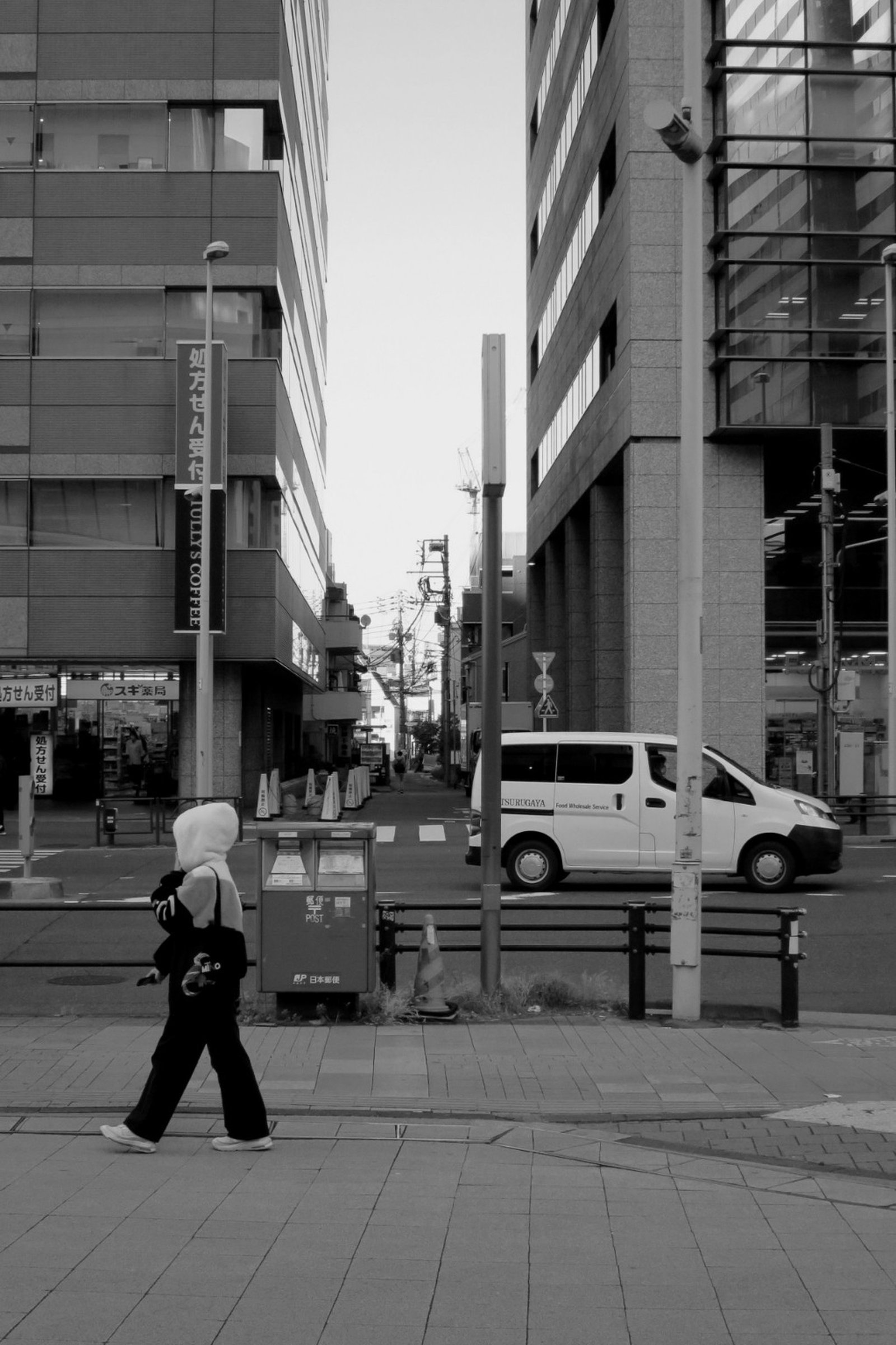 Through the city's hard lines, a white hood drifts alone. Not child, not adult just a form without a name. The world passes, blind. But in that quiet weight, something lingers. A question, unanswered.