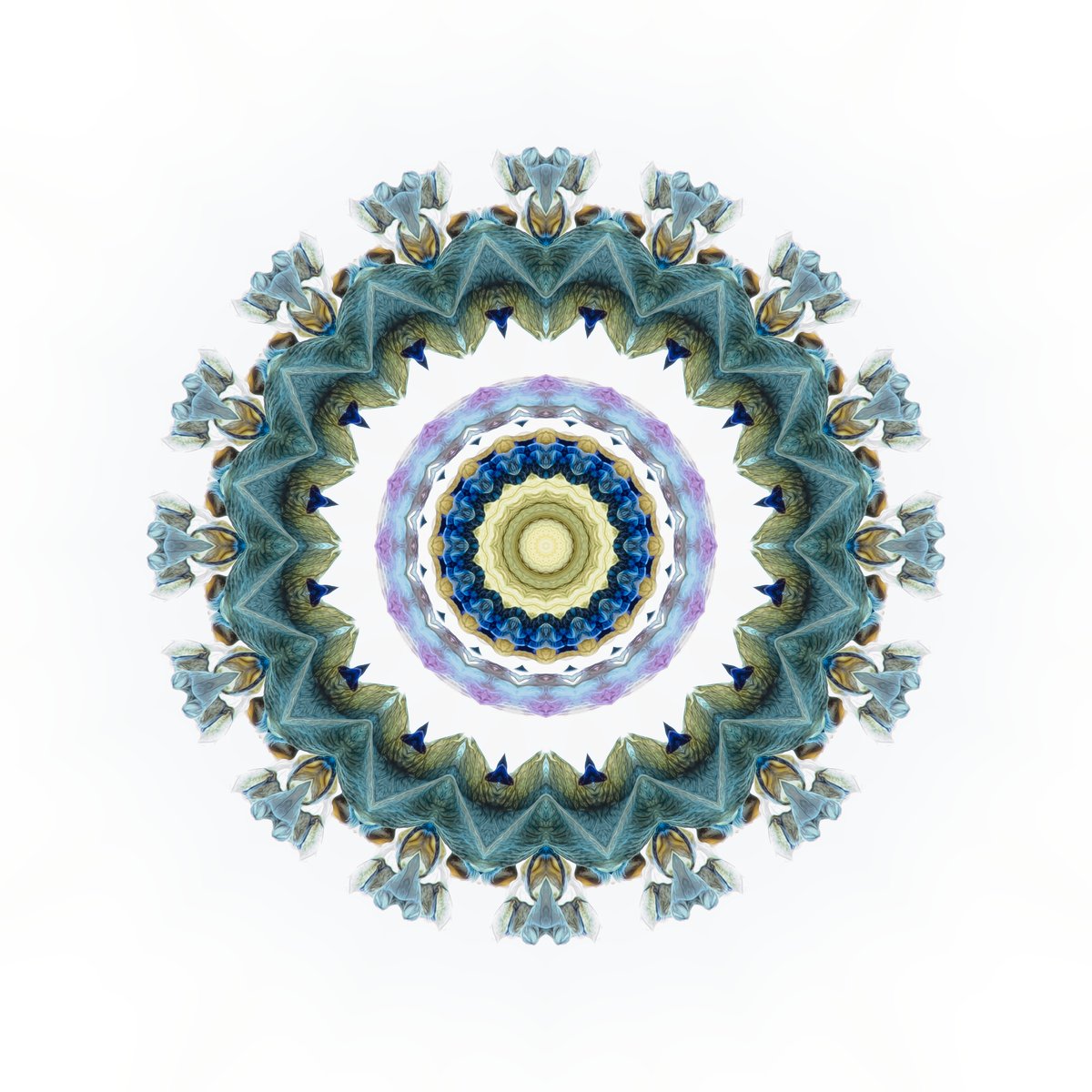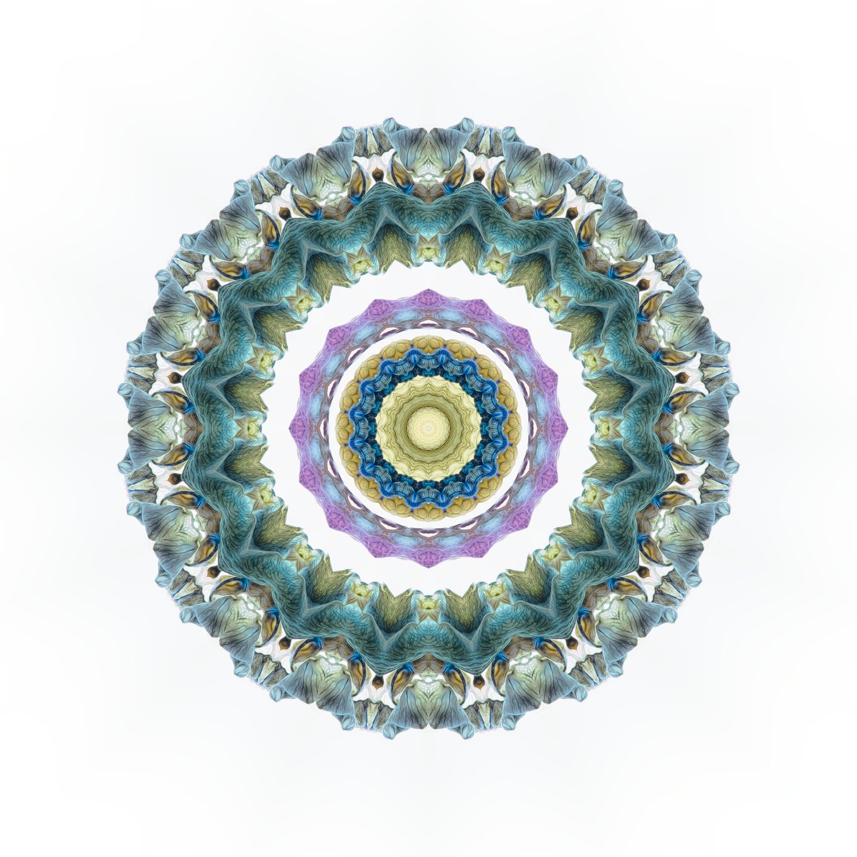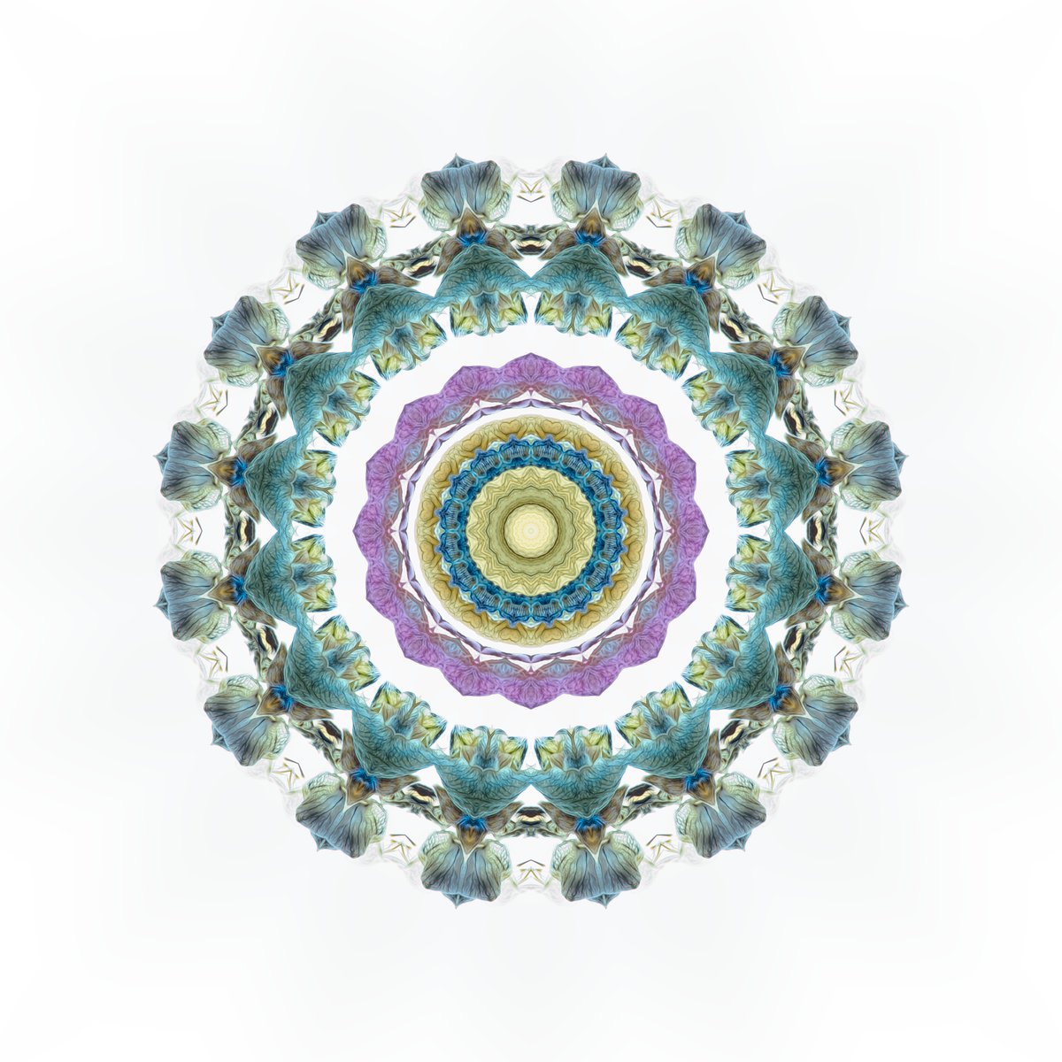 During the late summer, I had collected some of the lupins that grown fairly prolifically around here. I had done some photography with them but then kept the flowers to see whether they would be worth photographing again when they had started to fade. As time went on, I didn't do what I had intended, but then the individual little flowers started to fall off. The colours had faded but were still quite beautiful and the texture seemed to be enhanced as the became more desiccated. I decided to scatter them across a lightpad and then image them to see how well the textures showed up and whilst the outcome of this was rather beautiful, I wondered whether by using some mirroring and distortion of those images, I could produce something a little out of the ordinary. These three mandalas are the result of that experimentation