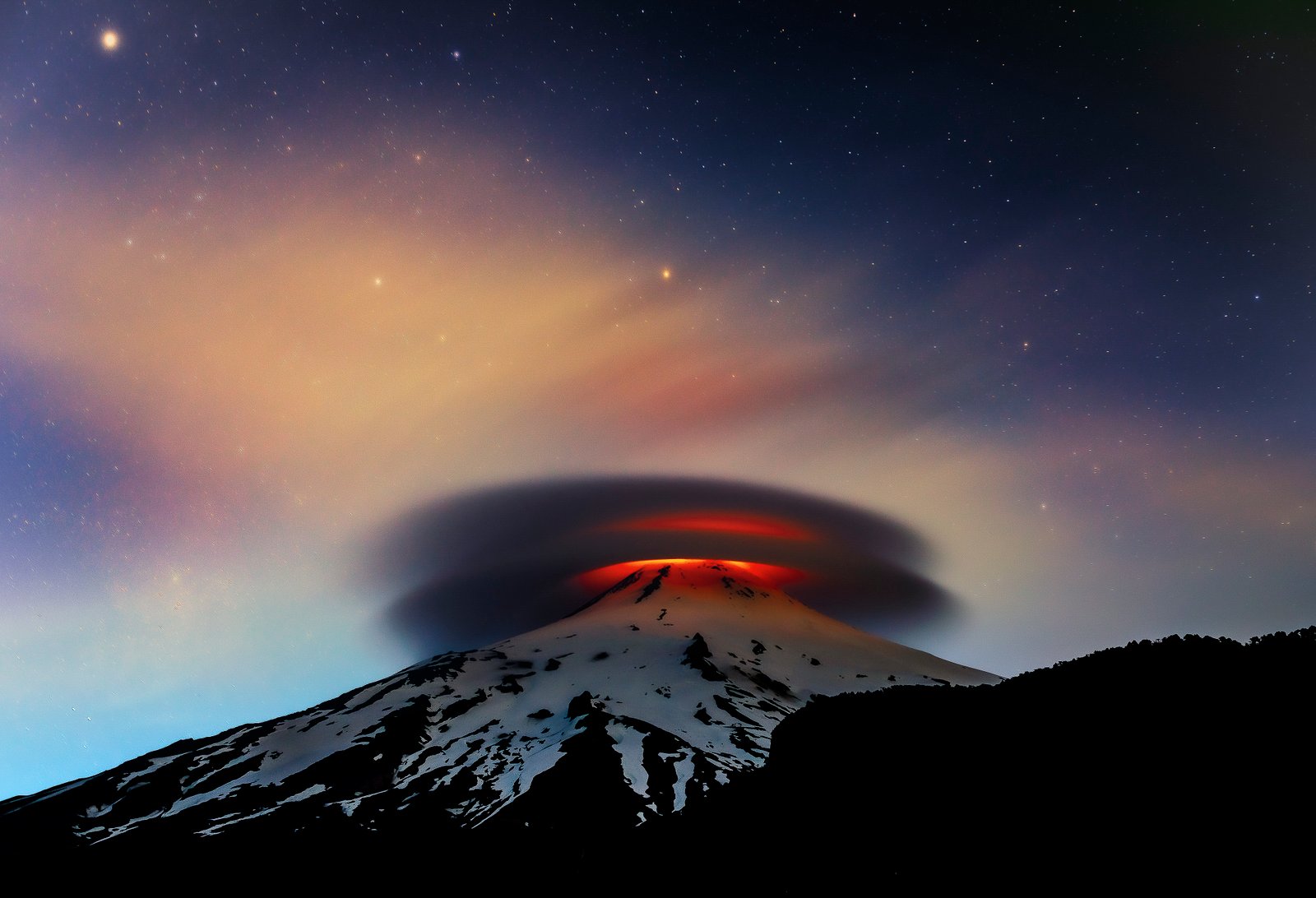 Pucón, Chile. Villarrica is the most dangerous volcano in Chile and one of the most active in the Americas. In the photograph, lenticular clouds can be seen rotating over the volcano as the lava flow illuminates them on a December night.