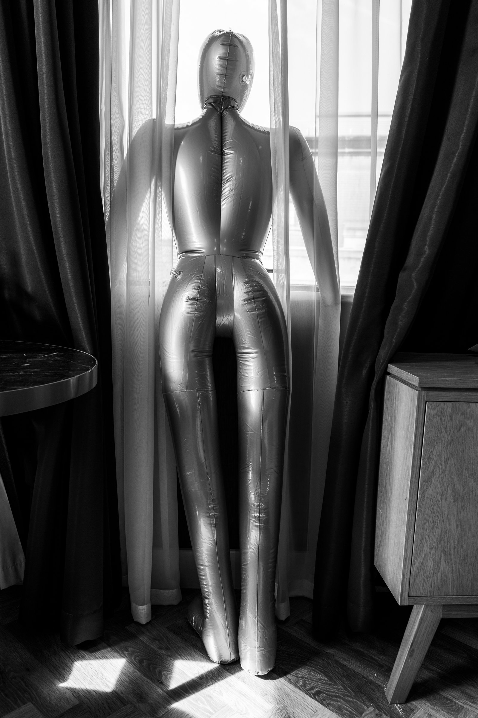 Someplace / Not Here / Still There, But Not explores cycles of confinement, escape, and the shifting desire for connection. Shot in hotel rooms, city streets, and liminal spaces, the series follows a solitary figure with an obscured face, moving between interiors and exteriors that feel both restrictive and unreachable. There is a constant tension between enclosed domestic spaces and the overwhelming sprawl of the city — a disorientation between inside and outside, stillness and motion, intimacy and anonymity. Through contrasts of gesture and posture, isolation and proximity, the images reflect the quiet struggle to belong somewhere, or to someone. Through conceptual portraiture and anonymous fragments of public life, the work speaks to identity, habit, estrangement. Some figures reach outward; others retreat. Some places feel inhabited, others already changed. What remains is the trace of presence, the echo of movement — the sense that something was here, but perhaps no longer holds. Each image carries the residue of a moment passed — still there, but not as it was. (for more images see https://www.ymkollective.com/somewhere-someplace)