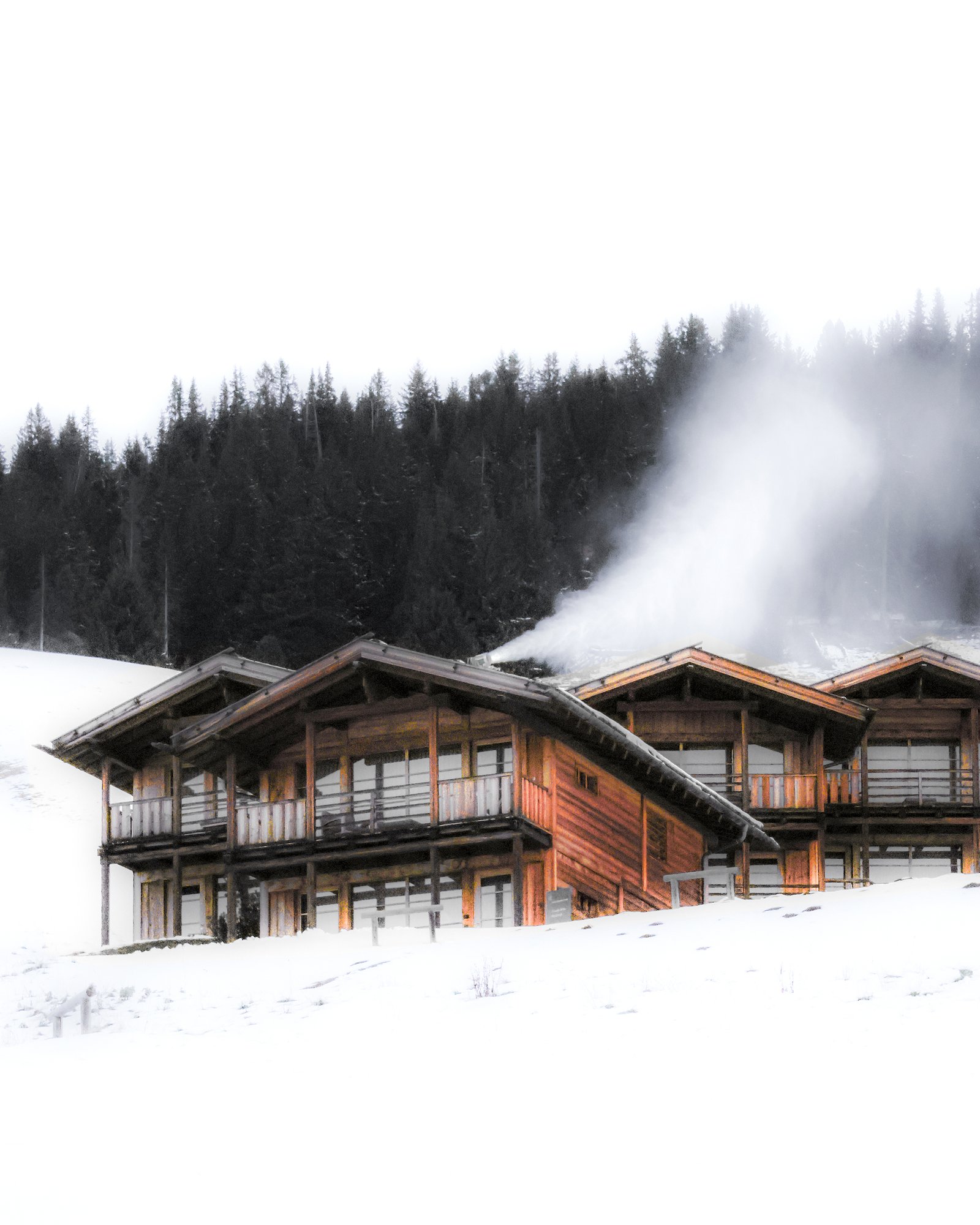 Nestled in the snowy folds of the Dolomites, these timber lodges stand at the intersection of architecture and alpine memory. With sharply pitched roofs, deep balconies, and rhythmic façades, they echo the vernacular logic of northern Italian mountain dwellings—structures built not only to withstand winter, but to belong to it. Smoke rises slowly against the forested backdrop, and warm interior light spills into the pale silence of snow. Winter Structures captures the dual nature of shelter in the high Alps: both functional and emotional, precise yet intimate. It is a portrait of place where architecture becomes part of the landscape’s rhythm—anchoring solitude, warmth, and the human scale in vast terrain.