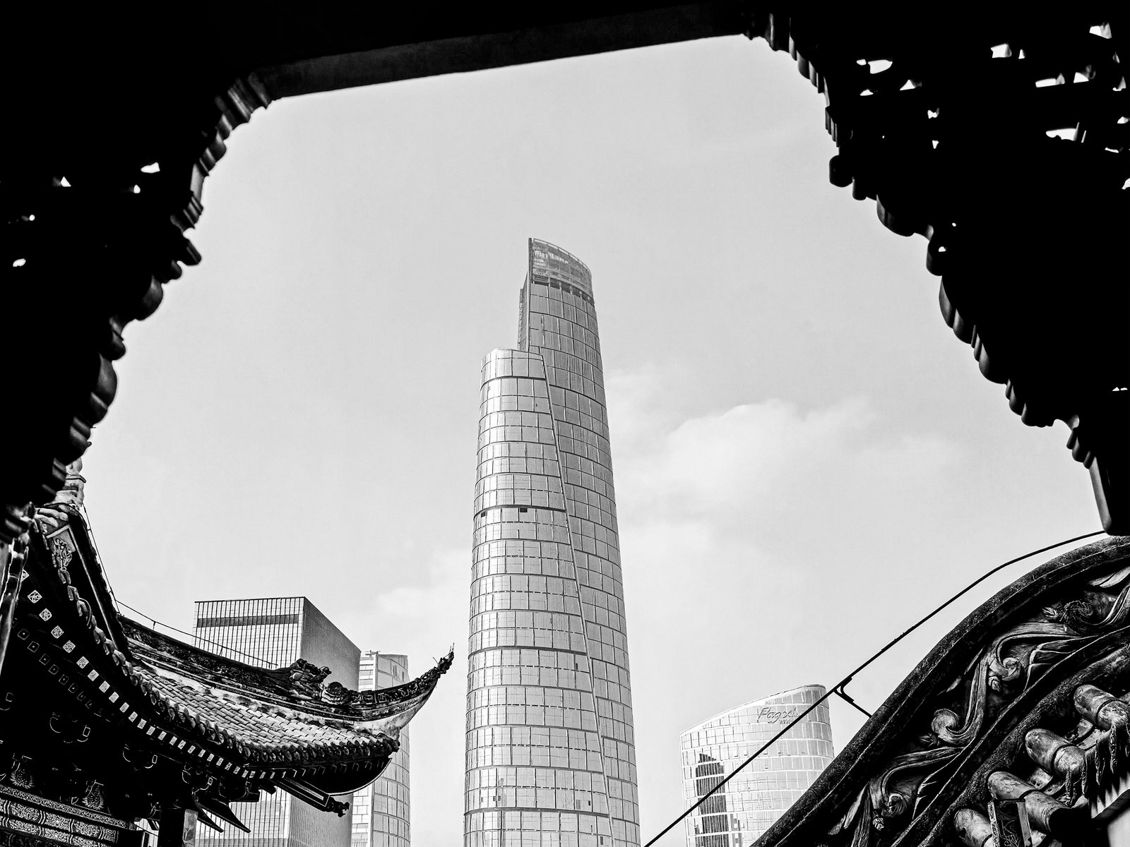 Old eaves cradle a rising tower in Chongqing—past and present aligned in silent symmetry.