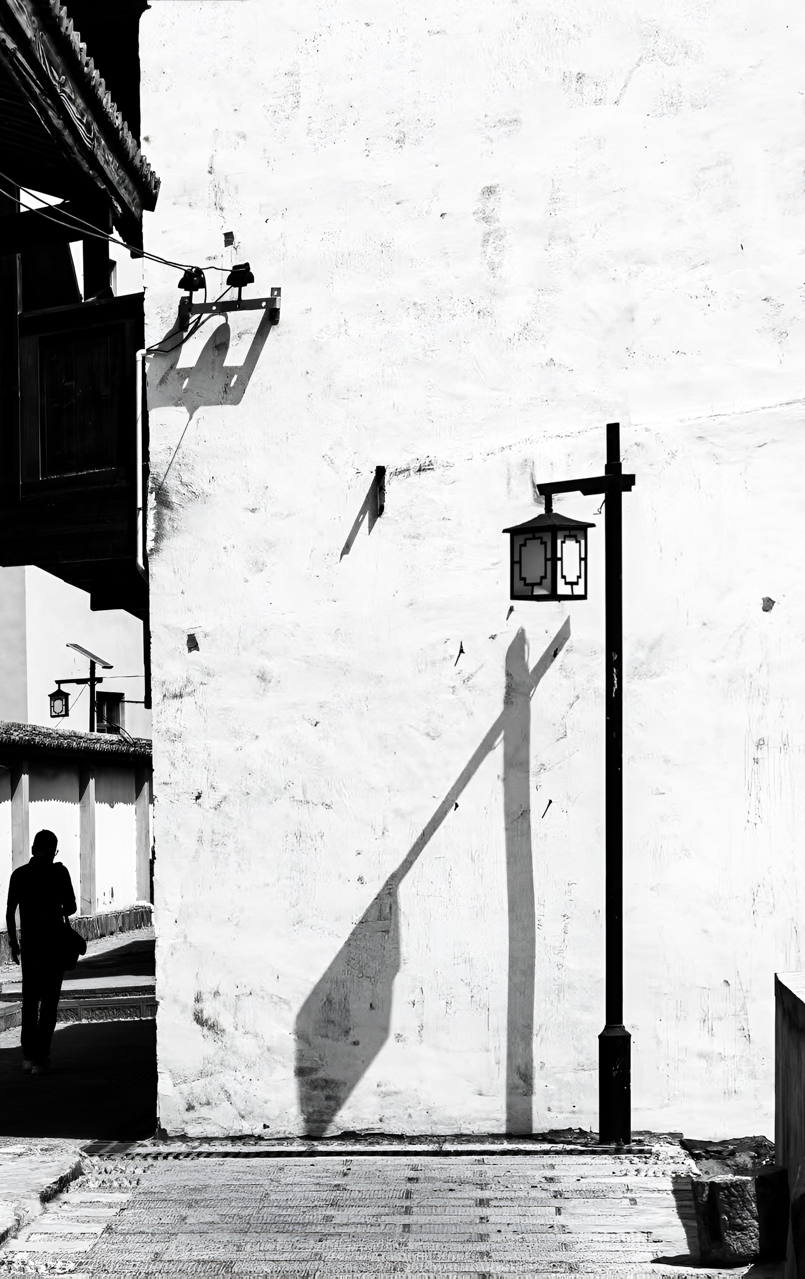 A lone figure slips into shadow as midday light carves sharp silhouettes across a whitewashed alley. Captured in an old town of China, the scene balances absence and presence, turning the mundane into monochrome poetry.
