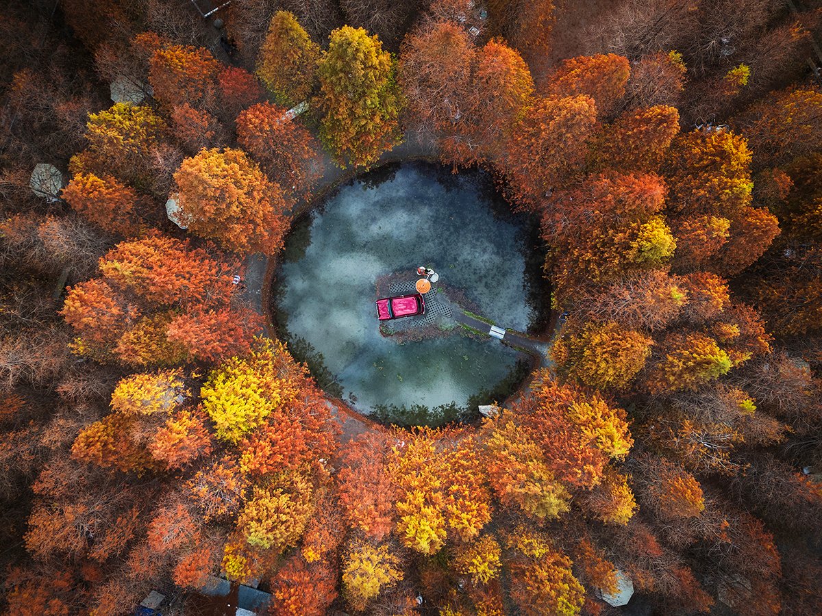 Beautiful circular bald cypress forest captured by aerial photography.