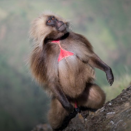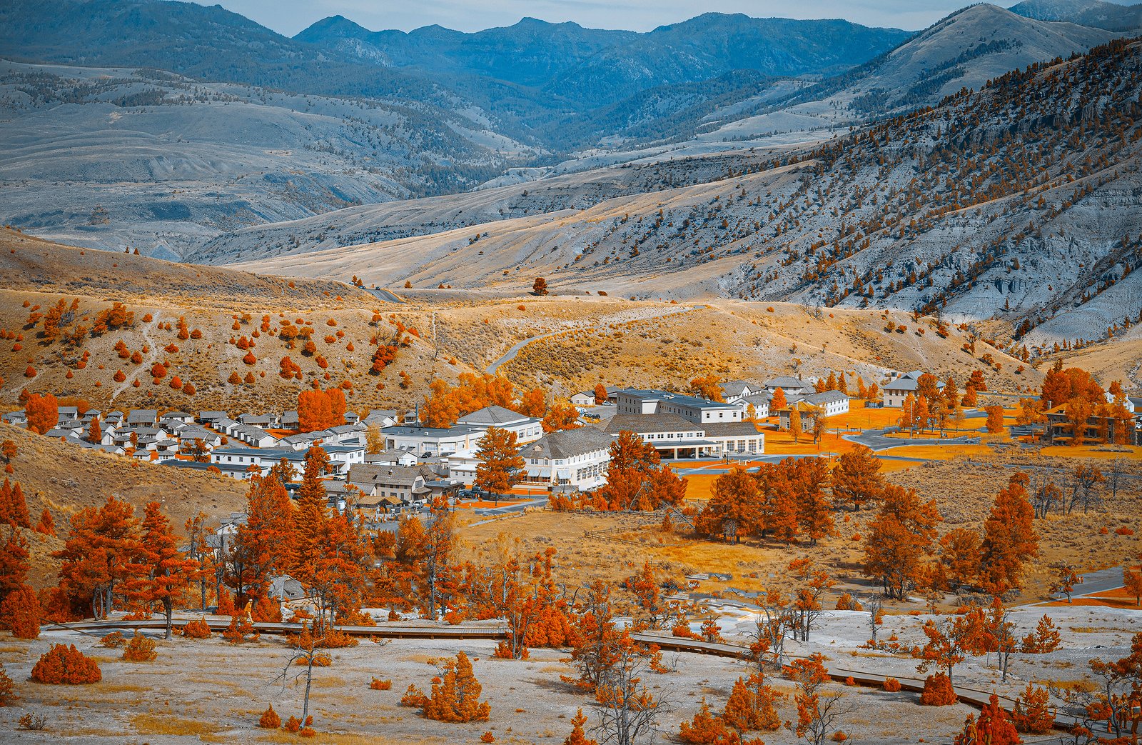 This infrared photograph captures Mammoth Hot Springs in Yellowstone National Park, USA, with stunning false-color effects. The image transforms the natural landscape into an otherworldly scene where vegetation appears in brilliant orange and red hues, contrasting dramatically with the pale, almost ethereal mountains in the background. The small settlement nestled in the valley shows a mix of white and gray buildings -- surrounded by the infrared-enhanced foliage that glows like autumn fire. A solitary figure in an orange coat can be spotted on one of the boardwalks, appearing as the lone human presence in this transformed landscape - all other visitors seem to have mysteriously vanished during this unique photographic moment, adding an almost ghostly quality to the scene. The rolling hills and terraced landscape characteristic of the Mammoth area are clearly visible, with the famous limestone terraces appearing as lighter-colored formations. The layered mountain ranges recede into soft blue-gray tones, creating remarkable depth and atmosphere. The infrared technique reveals the hidden thermal signatures and vegetation patterns that aren't visible to the naked eye, giving this iconic Yellowstone location an almost surreal, painterly quality that emphasizes both the natural beauty and geological complexity of this famous geothermal area.