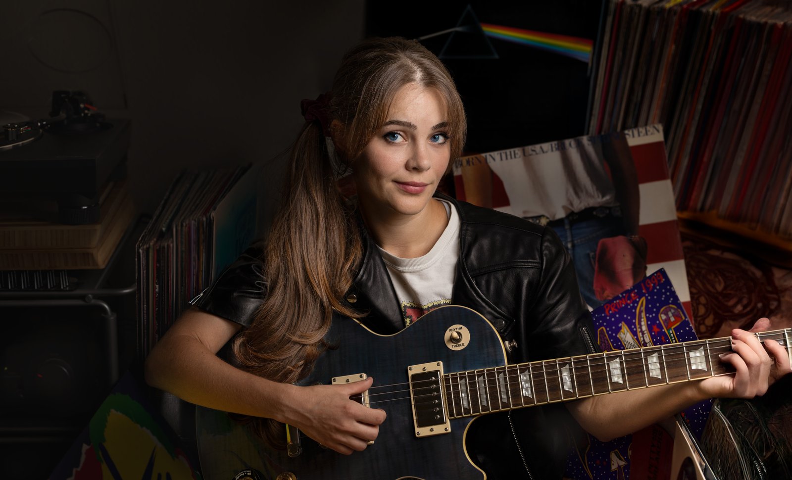 This captivating portrait beautifully captures the essence of a musician in her element, surrounded by the rich history of recorded music. The subject holds a classic Gibson Les Paul guitar - you can tell by the distinctive single-cutaway body shape, the cream-colored pickup rings, and that iconic gold hardware that Les Pauls are famous for. The guitar's dark finish contrasts elegantly with the silver accents, creating a timeless, professional look. What makes this image particularly striking is the setting - she's positioned among towering stacks of vinyl records that create a warm, nostalgic backdrop. The records suggest a deep appreciation for music history and analog sound, while her leather jacket adds a rock-and-roll edge that perfectly complements the Les Paul in her hands. The lighting is expertly handled, creating a moody atmosphere that highlights both her focused expression and the guitar's beautiful finish. The composition tells a story about the connection between past and present in music - the vintage vinyl collection representing decades of musical heritage, while the Les Paul (a guitar that's been a cornerstone of rock music since the 1950s) bridges that history with contemporary artistry. It's a perfect contest entry that celebrates both the instrument and the musical journey it represents.