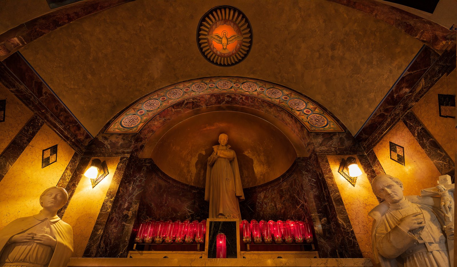 This image captures the solemn beauty of a church interior on Pittsburgh's South Side, showcasing remarkable architectural and artistic details. The focal point is a central apse featuring a standing religious figure, likely a saint or Christ, positioned within an ornate arched alcove. The warm golden lighting creates an atmosphere of reverence and contemplation. Several notable elements define this sacred space: Architectural Features: The church displays classical ecclesiastical architecture with its rounded apse, decorative arches, and use of what appears to be marble or richly veined stone columns and trim. The ceiling features intricate painted details and religious imagery, including what appears to be a dove symbol representing the Holy Spirit in the upper portion. Artistic Elements: The space is adorned with religious statuary positioned in niches on either side of the central figure. The decorative frieze around the arch contains repeated medallions or symbols, adding to the ornate character of the interior. The color palette of warm golds, deep reds from the votive candles, and rich marbles creates a sense of sacred grandeur. Devotional Aspects: Rows of red votive candles line the base of the sanctuary, indicating this is an active place of prayer and devotion. These candles, likely lit by parishioners for special intentions, add both spiritual significance and visual warmth to the scene.