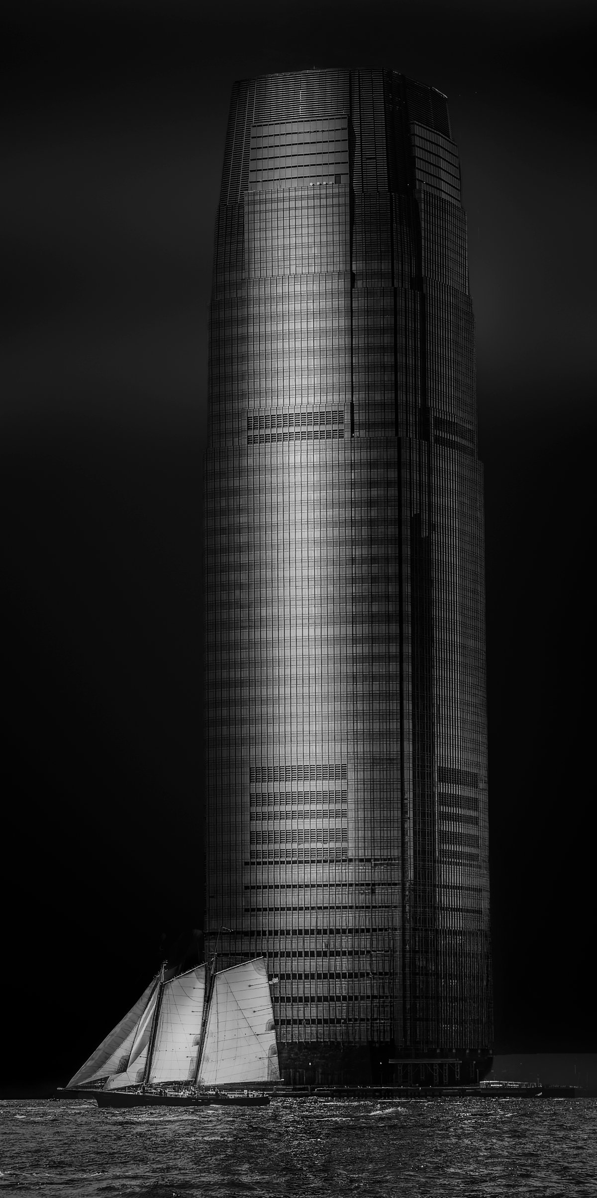 The image depicts a towering, futuristic skyscraper emerging from dark waters, its sleek, grid-like facade illuminated against a moody, black sky. At its base, an 18th-century clipper ship with billowing sails glides eerily, blending the past and future in a haunting maritime scene.