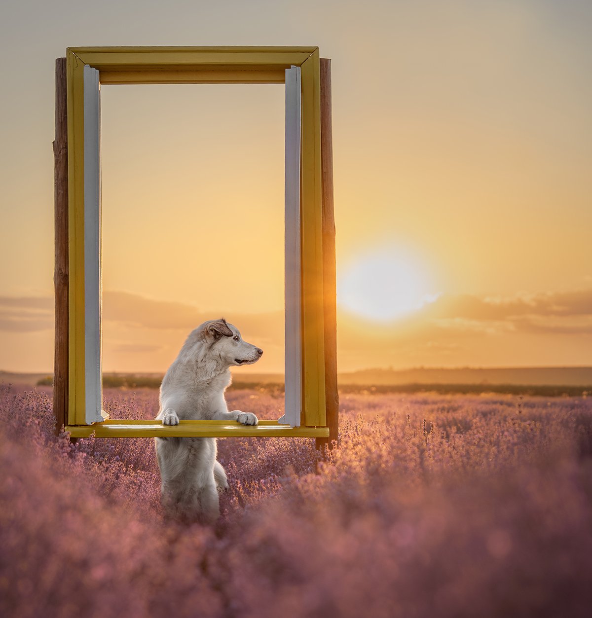 Bathed in the warm glow of the setting sun, surrounded by blooming lavender, paws perched on the floating windowsill and gazing intensely through this frame as if it were a portal. It's a simple scene, a quiet evening, yet it feels like a moment suspended between reality and something just out of reach. I wanted to create an image that looked like a scene taken out of a fairytale.