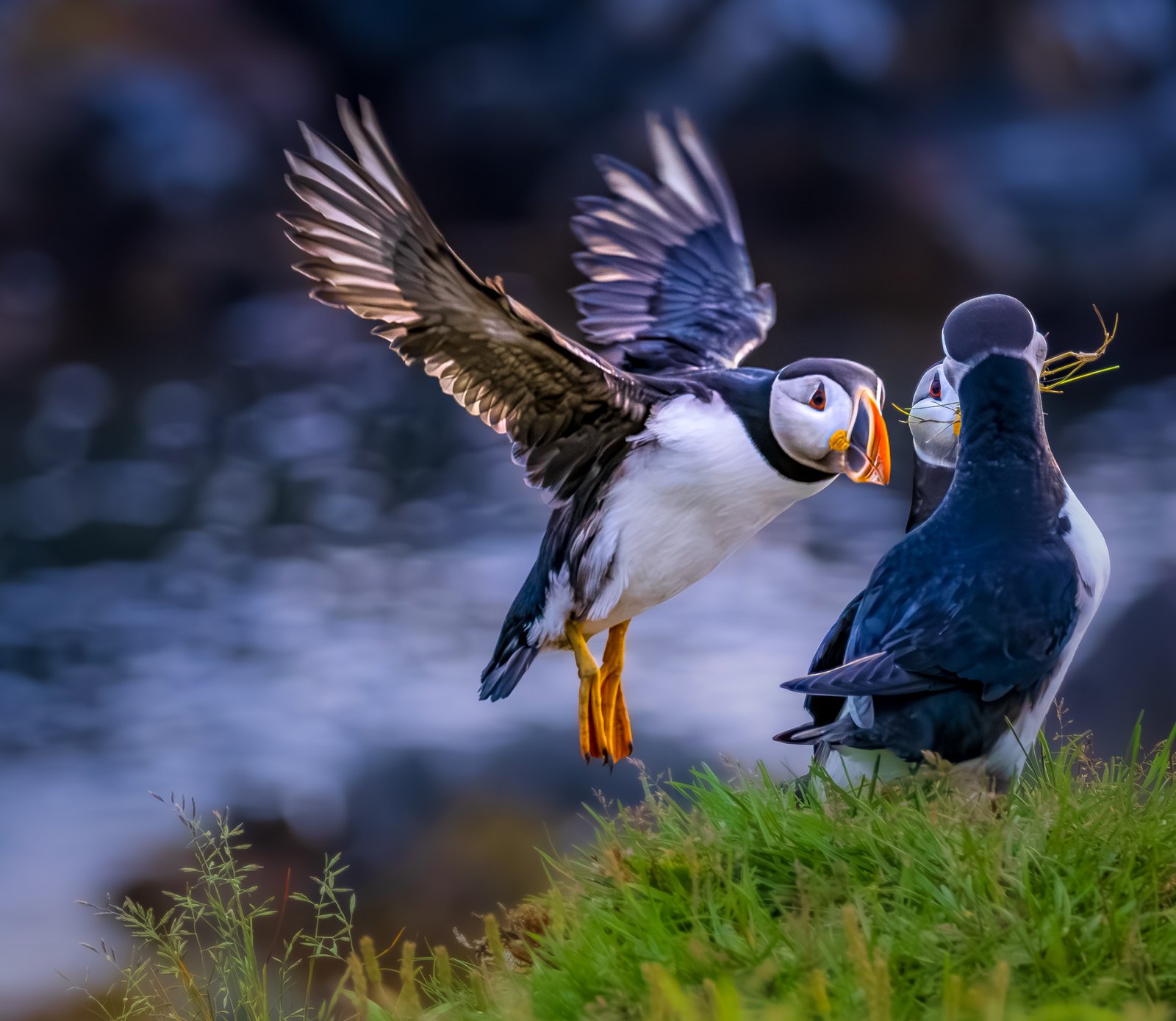 Move! As I watched the lively puffins glide in for a landing, this one particular puffin caught my eye. It was as if she yelled to her friends, "Stop your squabbling and move before I run into you." Bonavista, Newfoundland, did not disappoint as it provided hours of fun watching the antics of the birds as they gathered nesting material and communicated, sometimes fighting, arguing, or snuggling, with each other. The sunrise also provided rim lighting on her feathers, creating a lovely frame for her.