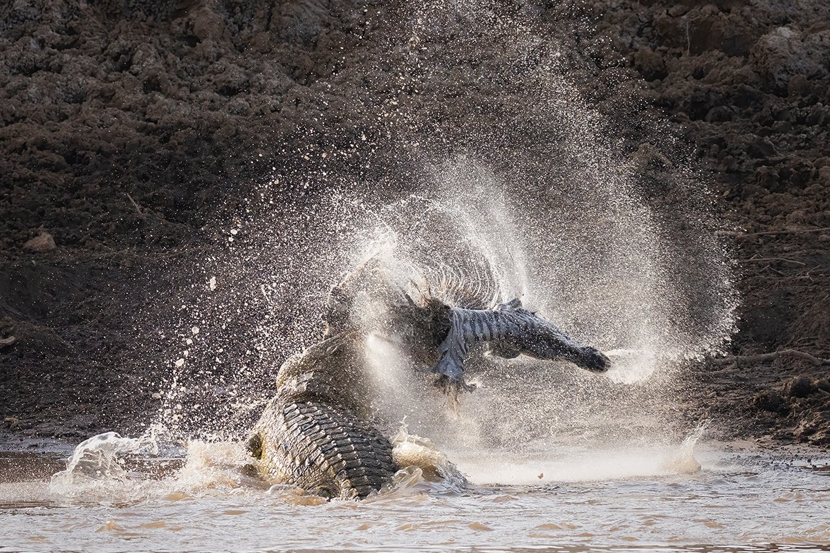 Whilst waiting for the wildebeest to gather to cross the Mara a crocodile was finishing an earlier kill of a zebra. I wanted to capture the power of the crocodile as it thrashed the zebra in its jaws from side to side in the water.