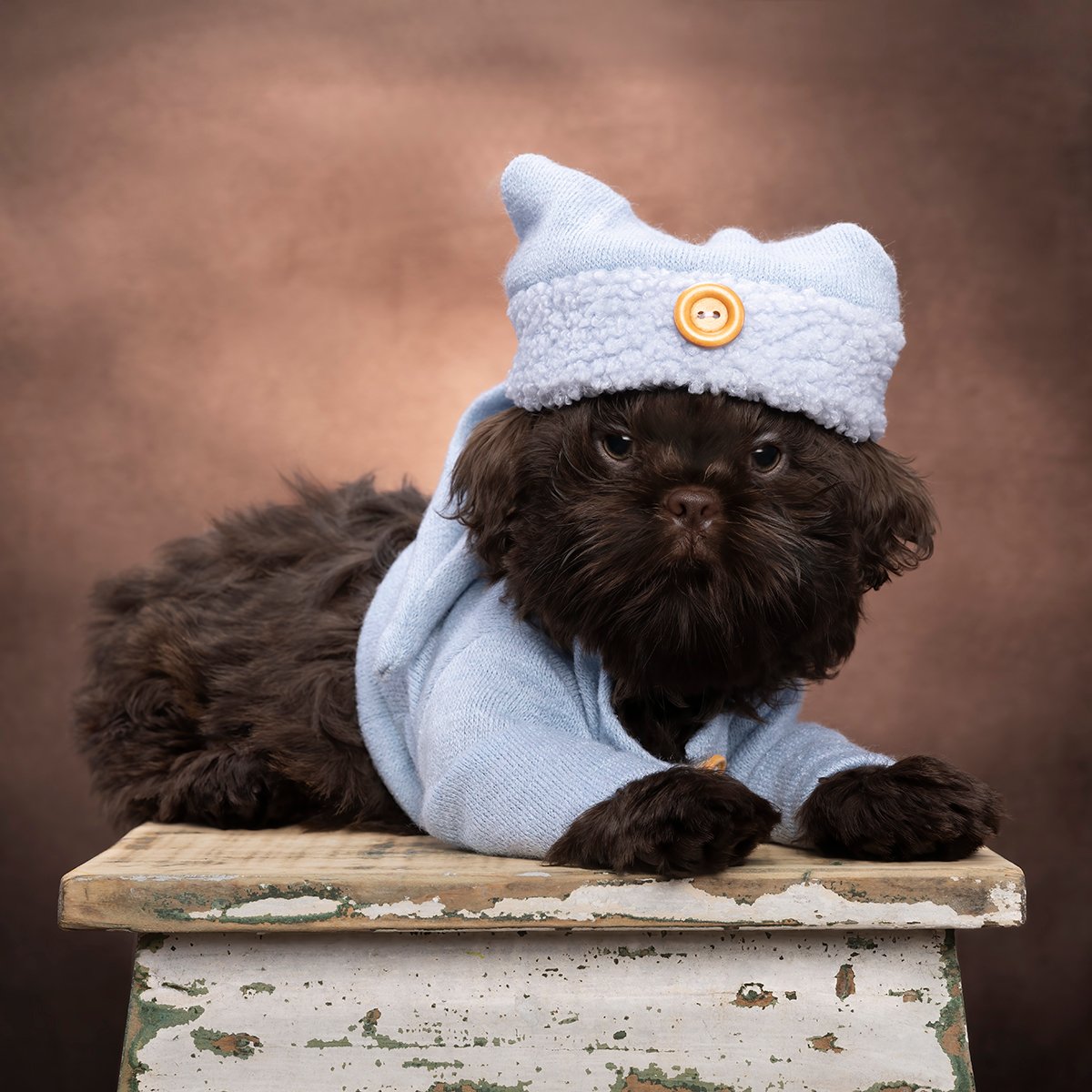 I had just finished photographing my new grandson when Gimlet arrived. So I thought why not use the newborn clothes.