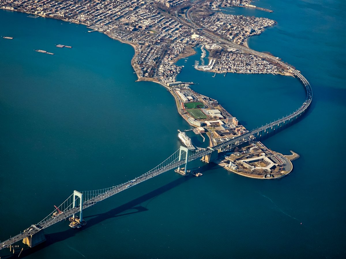 An aerial view captured while flying to New York, showcasing the elegant span of a bridge linking two stretches of land across the water.