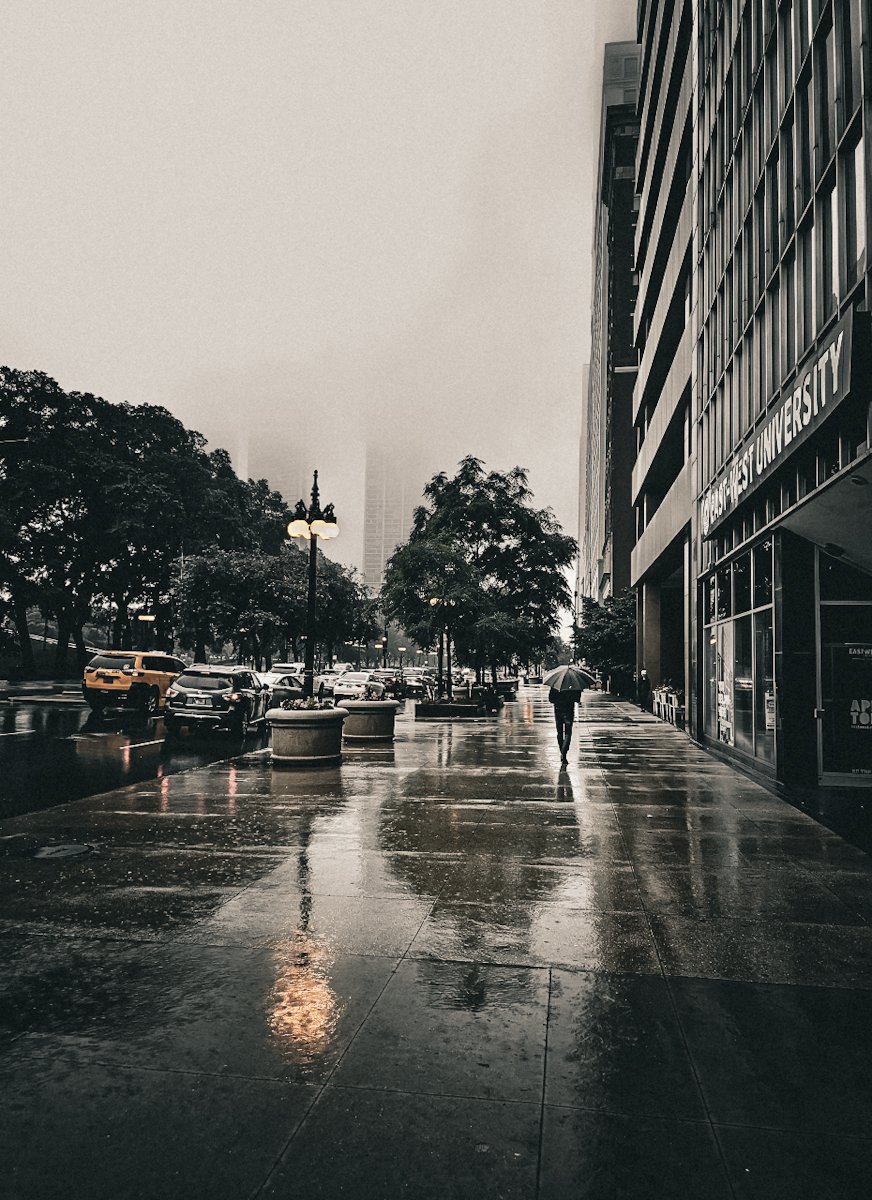 Mist drapes the skyline as rain slicks the pavements, softening the city’s edges into a hushed psuedo-monochrome. Figures move through the scene — some solitary, some in quiet pairs — their forms drawing the eye against the reflective streets, small human notes in an otherwise veiled metropolis. The photo was taken in Chicago, US.
