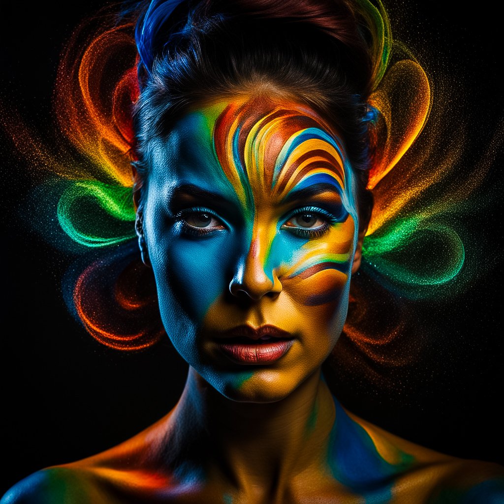 This photo series is part of an ongoing research project that explores how human emotions can be translated into visual art using AI. The system begins by detecting emotions from either text or audio using an emotion classification model. Based on the identified emotion, an open-source language model generates landscape-inspired visual descriptions. From these descriptions, the system deduces likely color palettes, shapes, and compositional patterns associated with such environments and emotions. These visual cues are then artistically embedded onto human faces through AI-powered image generation, blending abstract patterns with portraiture. Each image in the series embodies a specific emotion—such as fear, serenity, euphoria, etc—through expressive facial designs, flowing painted motifs, and emotionally aligned color harmonies. While this explanation offers a simplified overview, the full AI pipeline involves a deeper integration of computational and generative techniques, which will be documented in a forthcoming technical research paper. The goal of this work is to promote social good through applications in art therapy, mental health, and emotional storytelling. Photo 1 denotes the emotion euphoria, Photo 2 denotes the emotion curiosity, Photo 3 denotes the emotion fear, Photo 4 denotes the emotion wonder, Photo 5 denotes the emotion melancholy, and Photo 6 denotes the emotion serenity.
