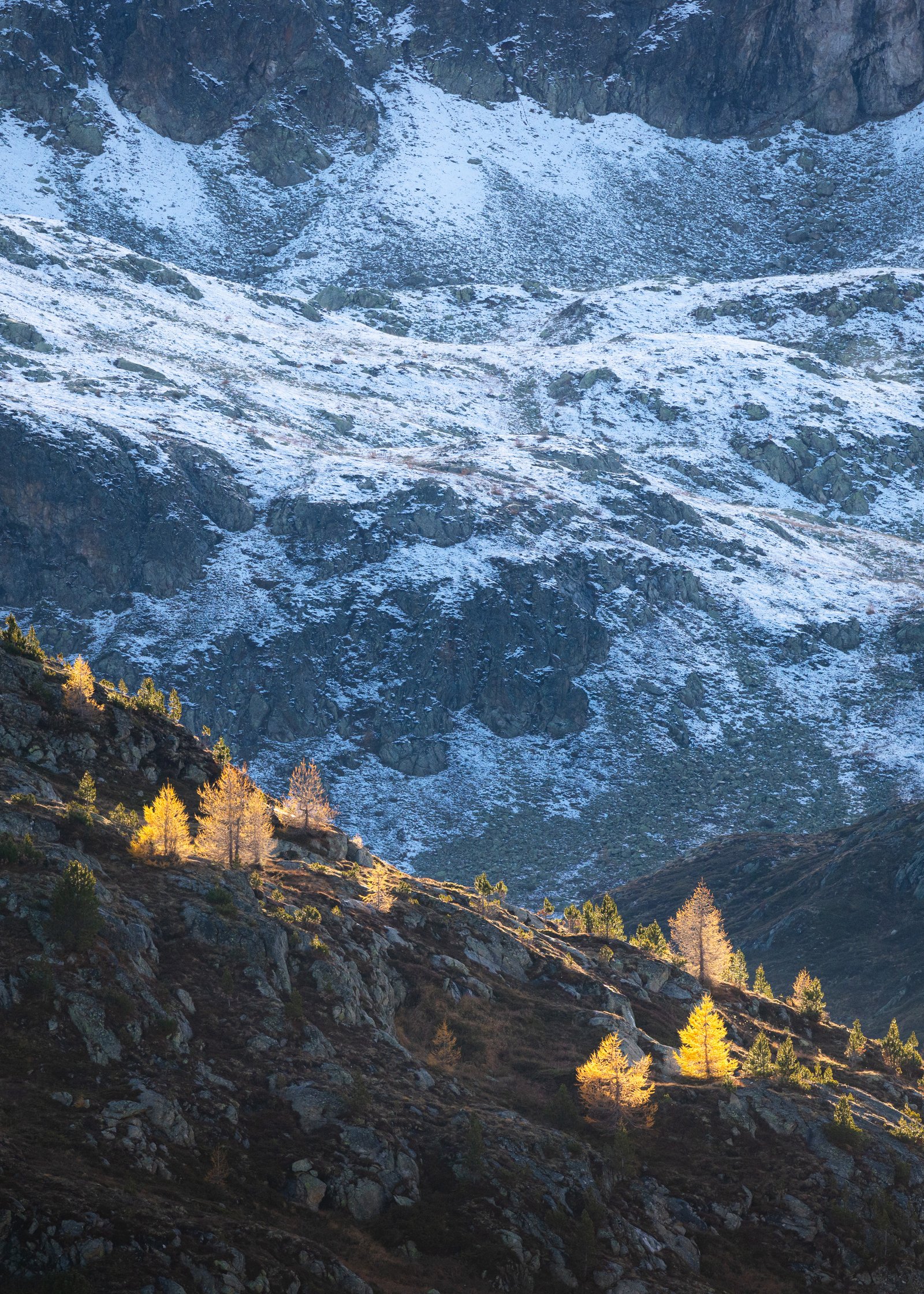 One afternoon in late October I decided to spontaneously go out trying to capture some final autumnal colours before they soon disappear and make way for winter. At first it didn't look very promising upon arrival but waiting patiently paid off and the sun reappeared. I love the contrast of the warm golden tones of the lit larches against the cold rocky and partially snow-covered mountain backdrop in this image.