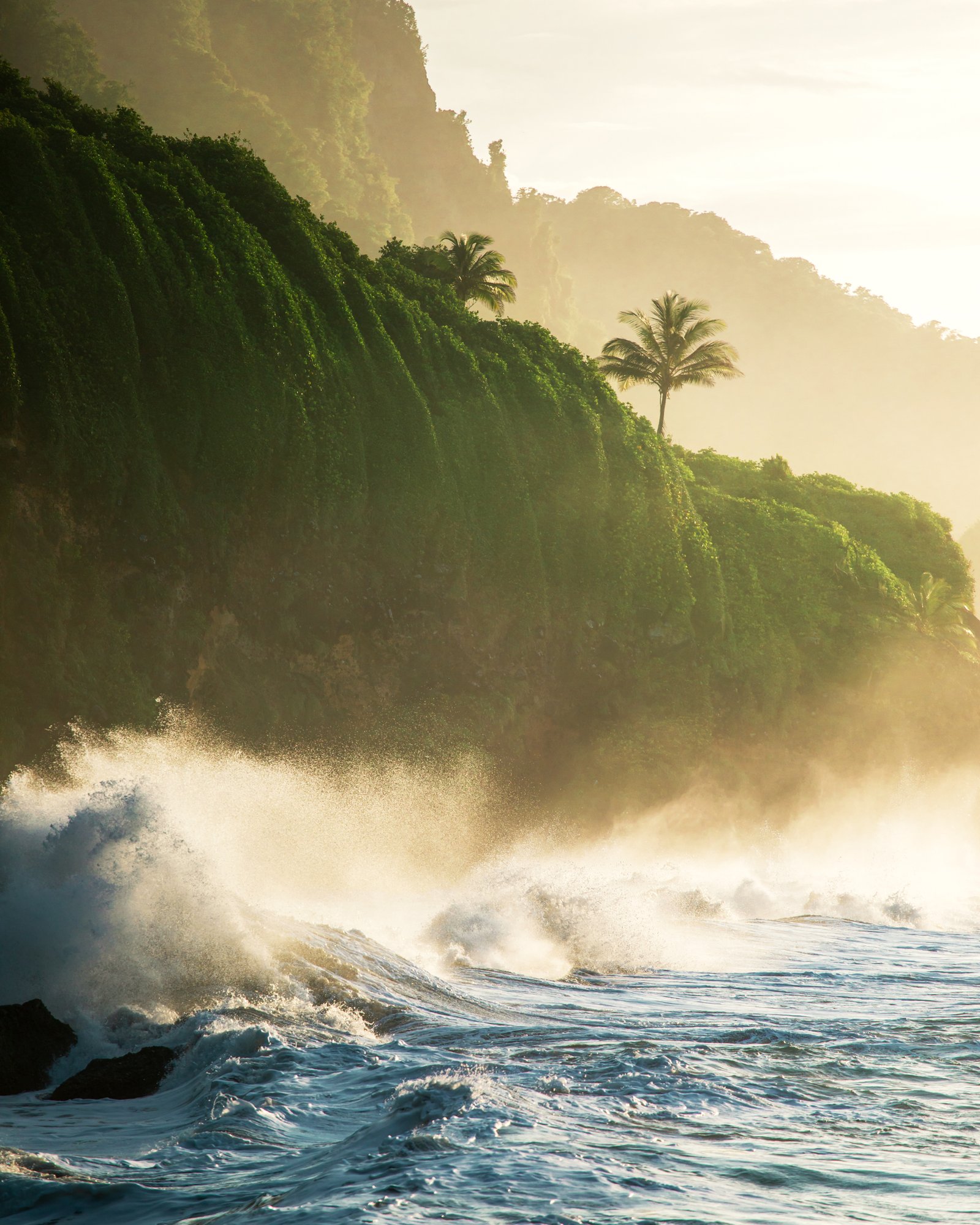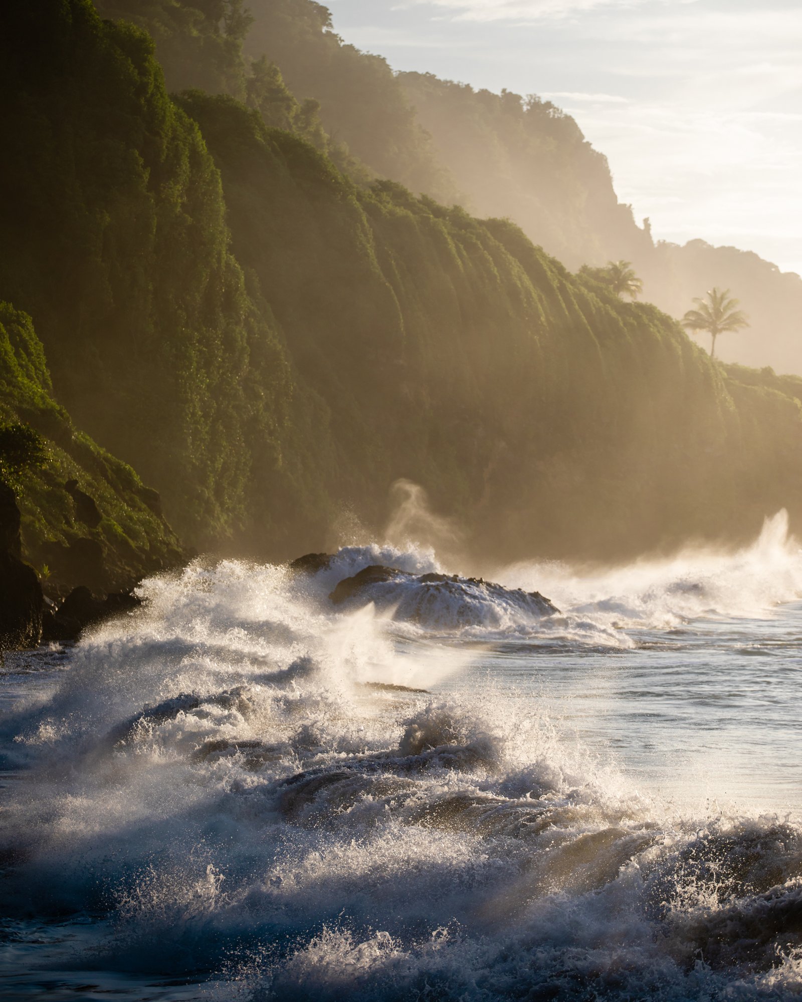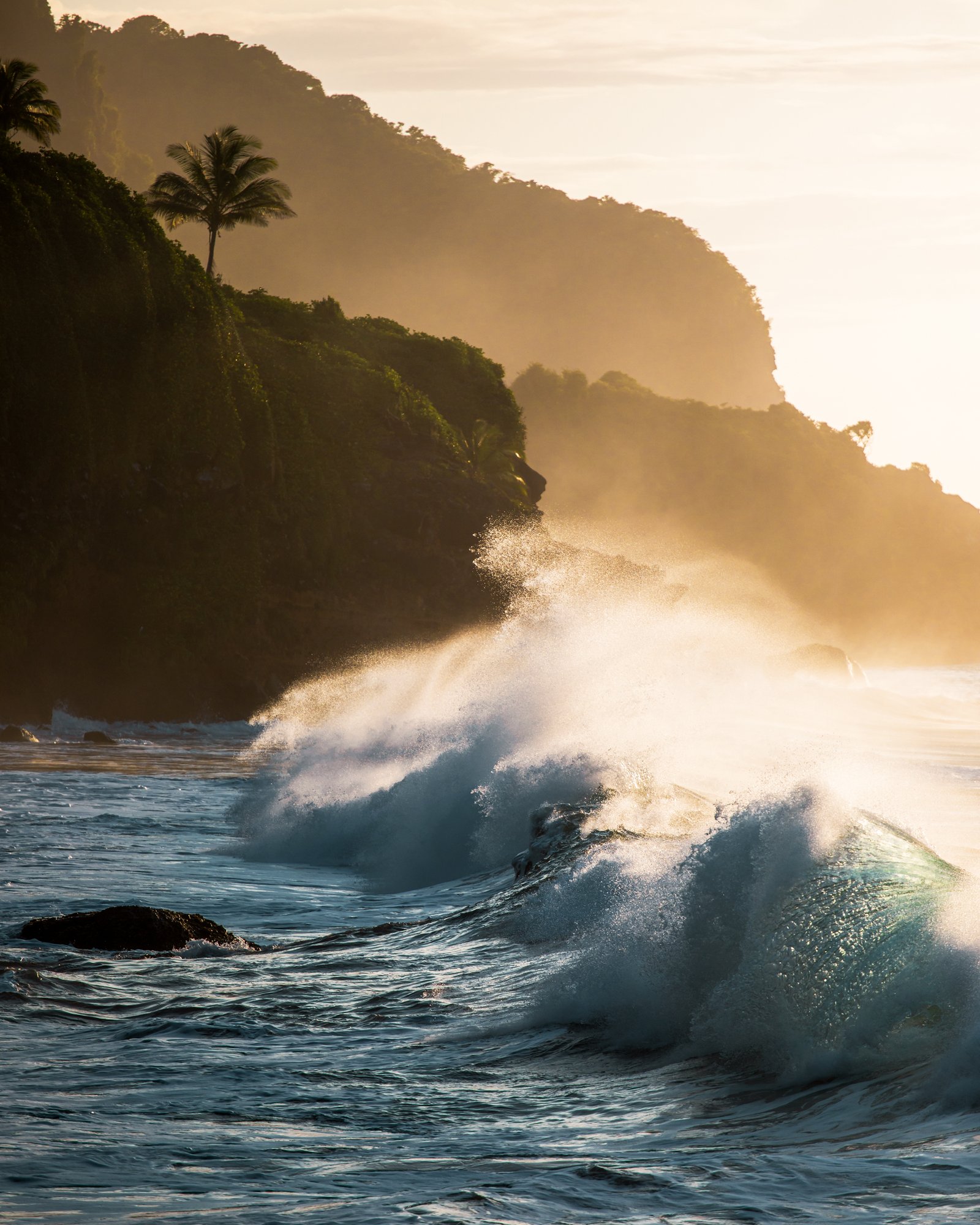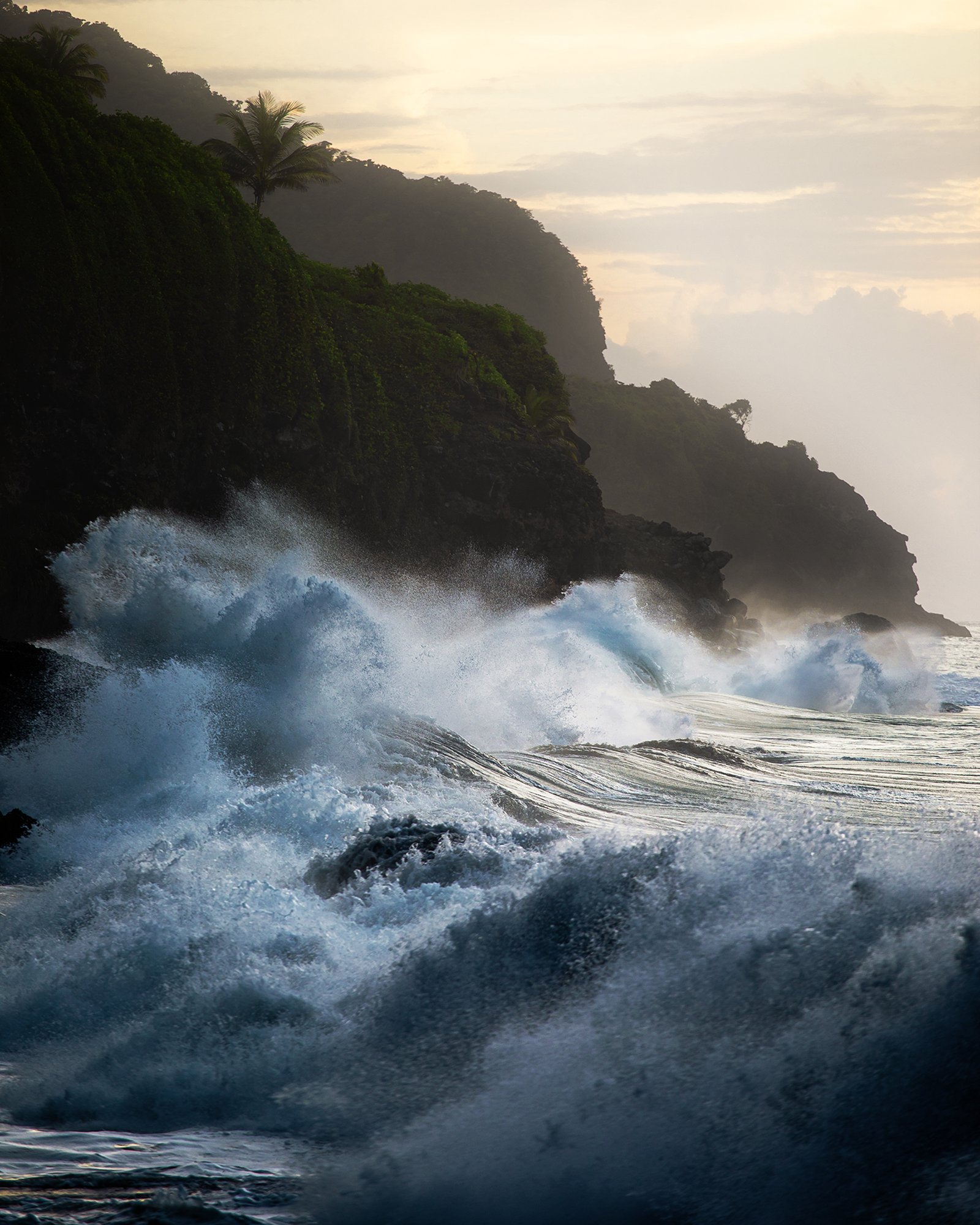 Ces photos ont été prises au Nord de la Martinique, alors qu'un ouragan passait à 500km au nord de l'arc Antillais. Ce phénomène créa une houle qui déferla sur la côte. Mon objectif était de capturer la puissance de ce phénomène naturel en y associant la beauté et la douceur de la lumière de l'heure dorée de la Caraïbe. Dans cette série, nous y trouvant ces deux idées parfois liées, parfois seule.