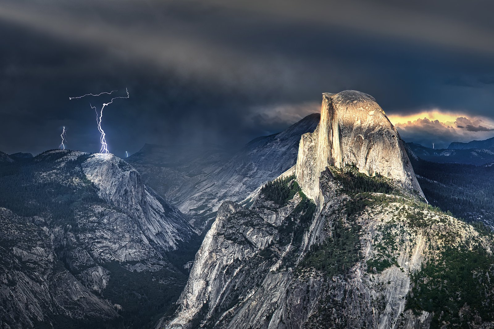 I drove from San Francisco toward Yosemite with some excitement. The entire way I chased a large thunderstorm - and I was hoping for some great photography if it played out right... By the time I arrived at the famous Glacier Point vista, the storm was already starting to dissipate. I wasted no time setting up my camera and clicked away as the light twisted and swirled. I noticed the clouds were opening in the distance, giving all the onlookers a fantastic view of what I call a reverse sunrise - where the setting sun lights the opposite sky up. This usually lasts only a few minutes then gone. After about 40 minutes, all the clouds broke apart and the show was completely over. Glacier Point standing above Yosemite Valley is one of North America's unsurpassed epic views featuring Half Dome's almost 9000 foot height.