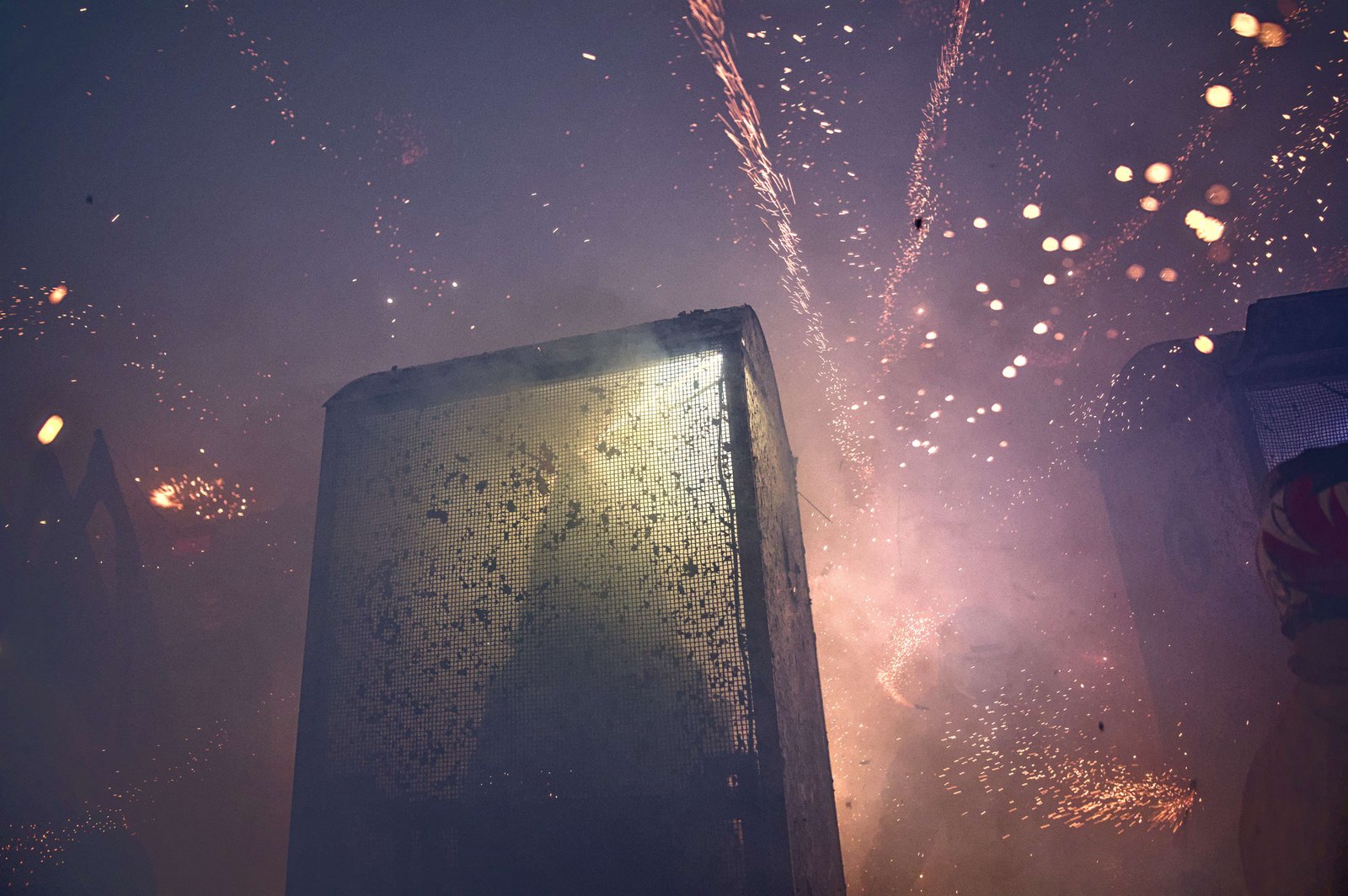 During the Lantern Festival in 2025, people wore hard hats and enjoyed the bombardment of honeycomb fireworks, symbolizing the removal of bad luck.
