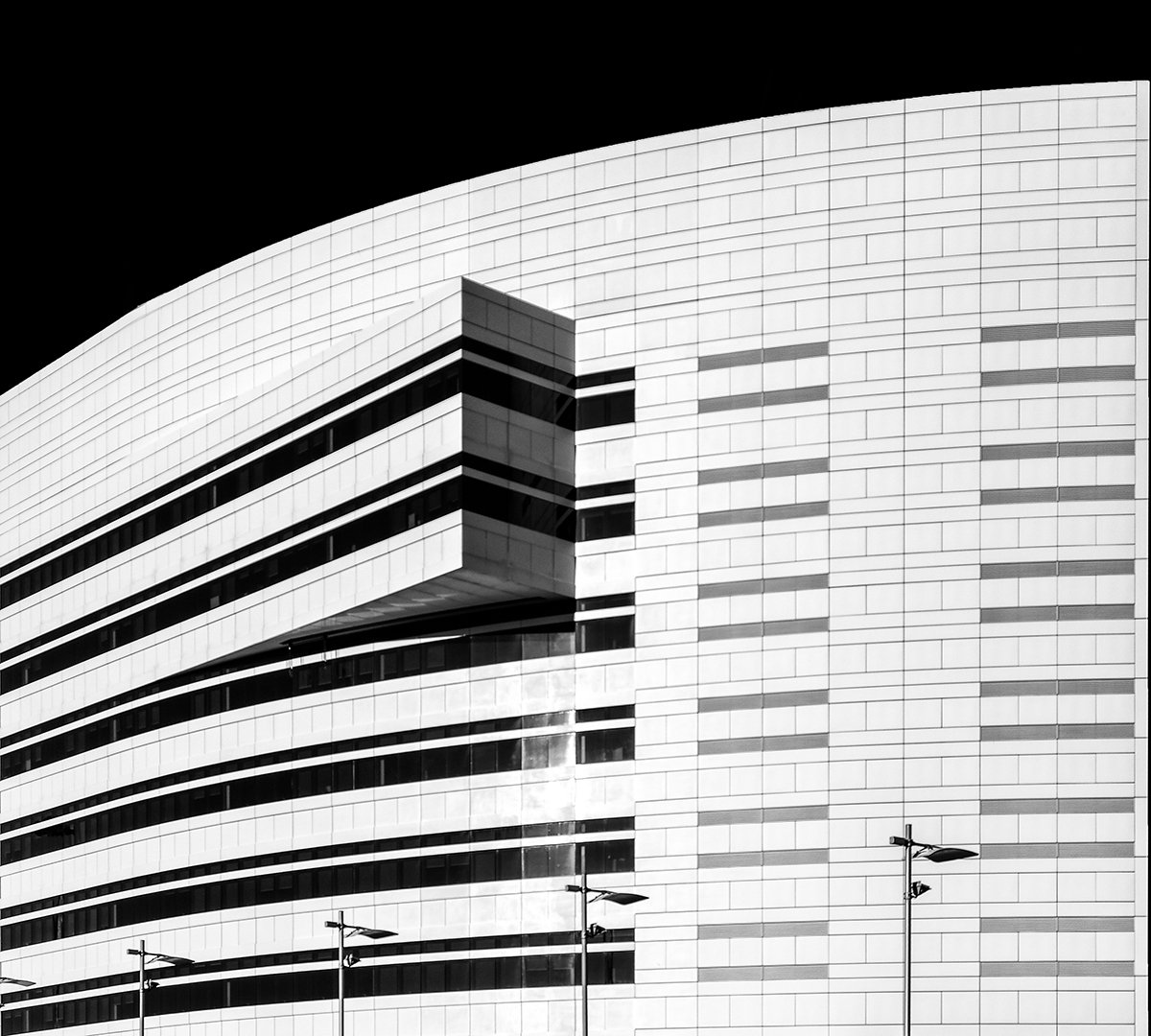“BLACK SKIES,” initiated in 2014, is an evolving project that will ultimately consist of no fewer than 50 works representing contemporary architectures and their details. The black sky serves merely as the background, enhancing the power of lines, definition, and movement, exacerbating the rationality of form and structure to focus the viewer’s attention on the exaltation of the purity of architectural lines, in a kind of metaphysical vision.
