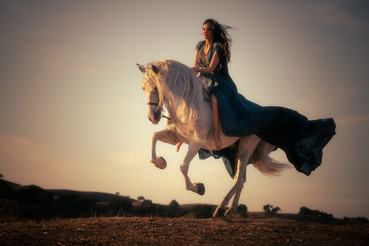 Bathed in the golden hues of a fading sun, Windborne captures a fleeting moment where power and grace become one. A woman rides a magnificent white Andalusian, its mane like streaming silk caught in the wind, hooves lifted mid-air as if defying gravity itself. Her flowing gown trails like storm-tossed sails, echoing the untamed energy of the landscape around them. Together, horse and rider appear not merely to move, but to soar—untethered, unbound, and guided only by the wind. This is not a journey of destination, but of spirit—wild, fearless, and free.
