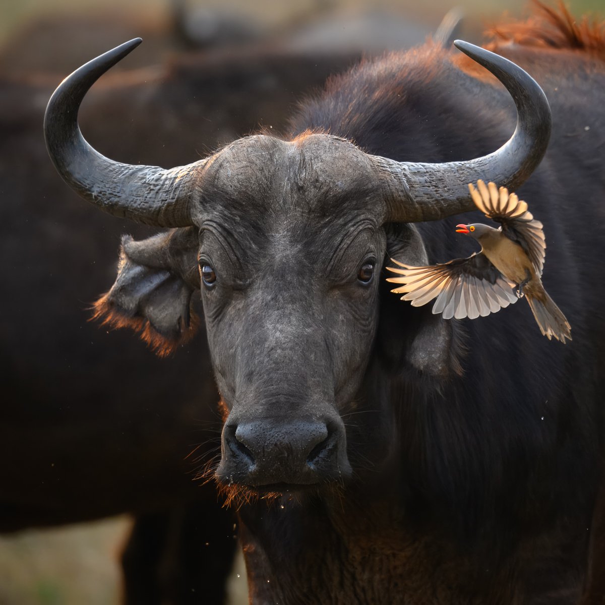 Red-Billed Oxpeckers can often be found near Cape Buffalo (feeding on ticks and other parasites on the buffalo’s skin). The wing position of the bird and the whole scene being backlit by a setting sun gave what would otherwise be an average looking portrait just that little bit extra.