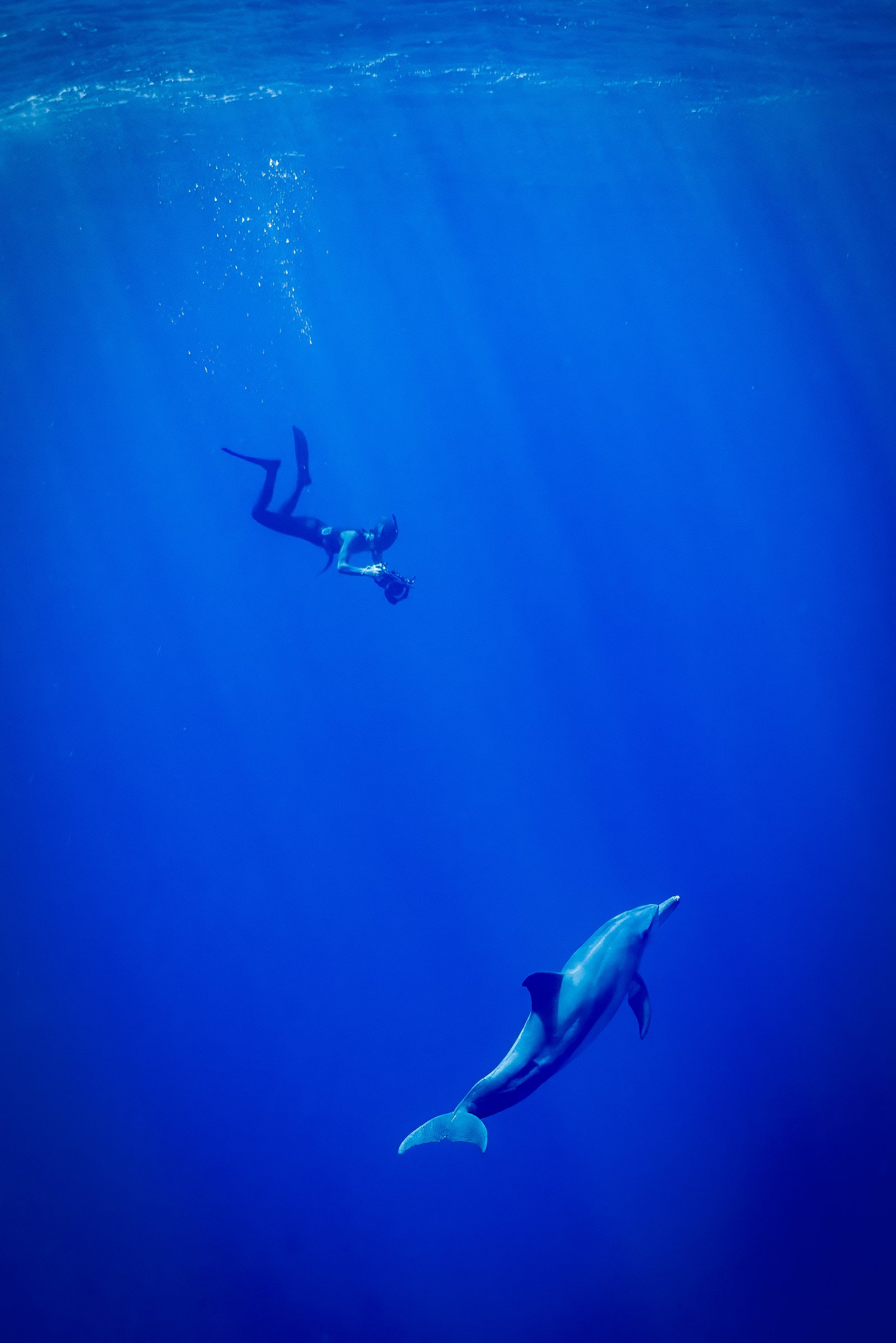 This image captures a profound moment in the vast blue ocean, where human and dolphin gracefully coexist. The deep blue expanse emphasizes the silence and wonder of the underwater world. It speaks to the shared space and the rare, beautiful connection possible between different species. A testament to nature's tranquility and harmony.