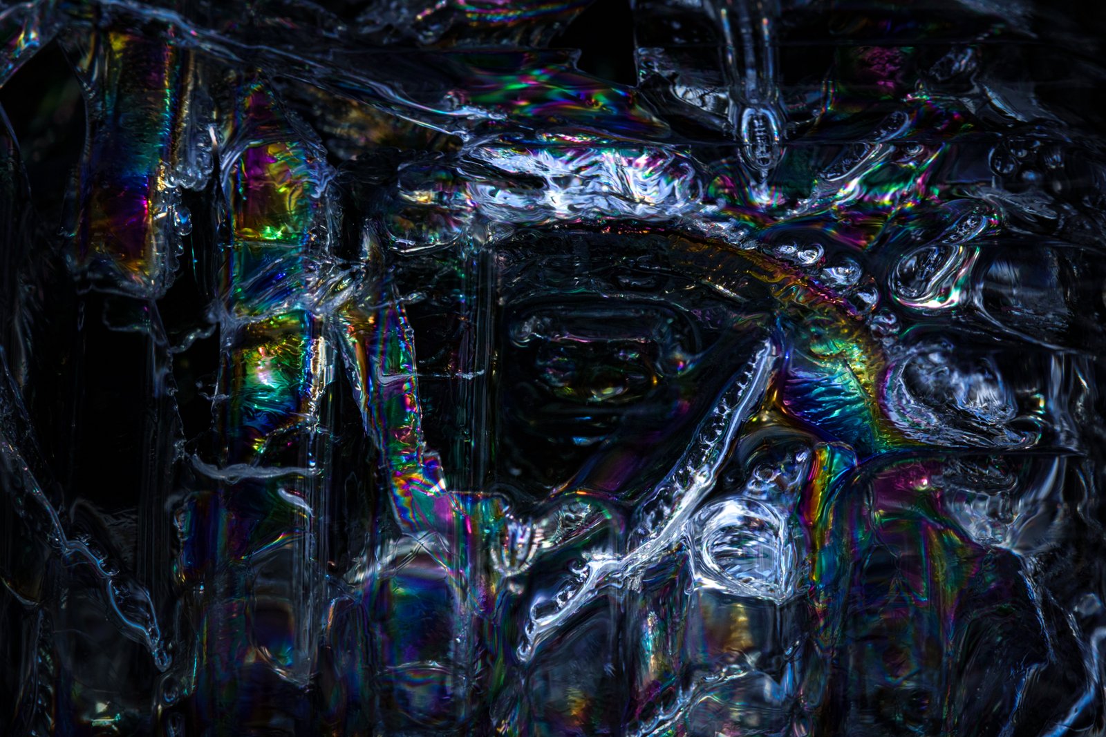 With the naked eye, the ice is clear or white, but viewed through a macro lens, it looks like a scattering of jewels. It shows various shimmering expressions.
