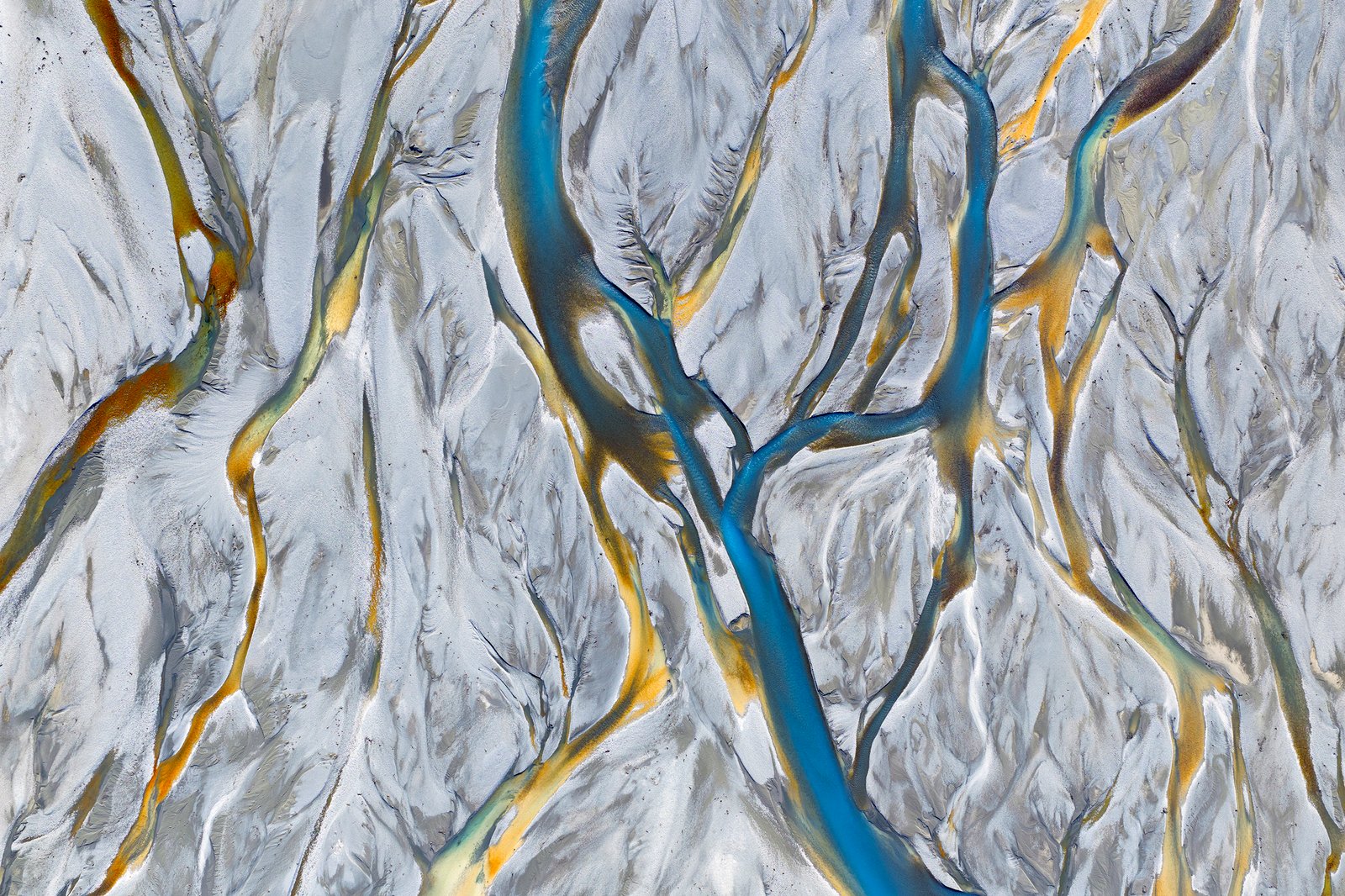 An abstract aerial photo of the mighty Tasman River on the South Island of New Zealand.