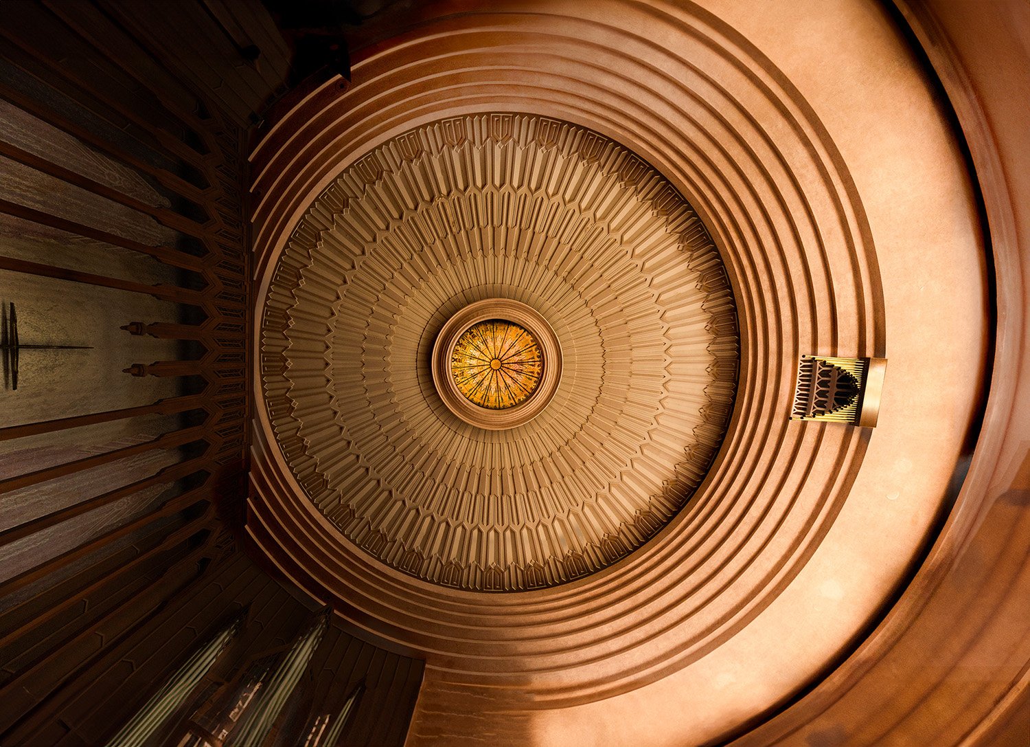 This breathtaking photograph captures the stunning interior dome of Boston Avenue United Methodist Church, completed in 1929 and considered one of the finest examples of ecclesiastical Art Deco architecture in the United States . The circular ceiling features zigzag patterns that go all the way around, with a "blinded oculus decorated with 'arrows' or 'feathers'" stretching over the heads of worshippers . The circular dome, 40 feet above the floor, symbolizes the infinite, and the chevron (herringbone) symbols and geometric shapes create this mesmerizing pattern that makes the church globally unique. The photograph beautifully captures the spiritual journey upward through the intricate concentric rings and decorative molding that draw the eye toward the divine center - a perfect example of how "all lines in the sanctuary lead to the pulpit, emphasizing the importance of the Word of God" .