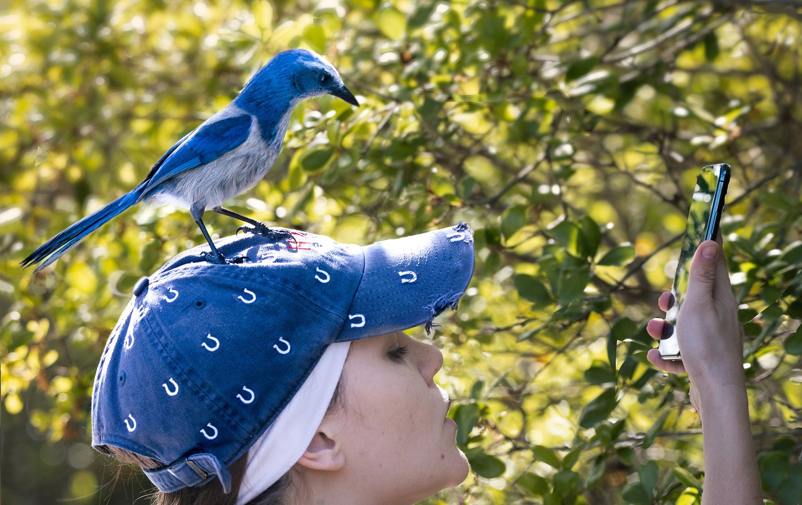 Taking a photo walk, a scrub jay landed on my friend's head. While she was taking a selfie the bird posed knowing the importance of looking at the camera while being photographed!