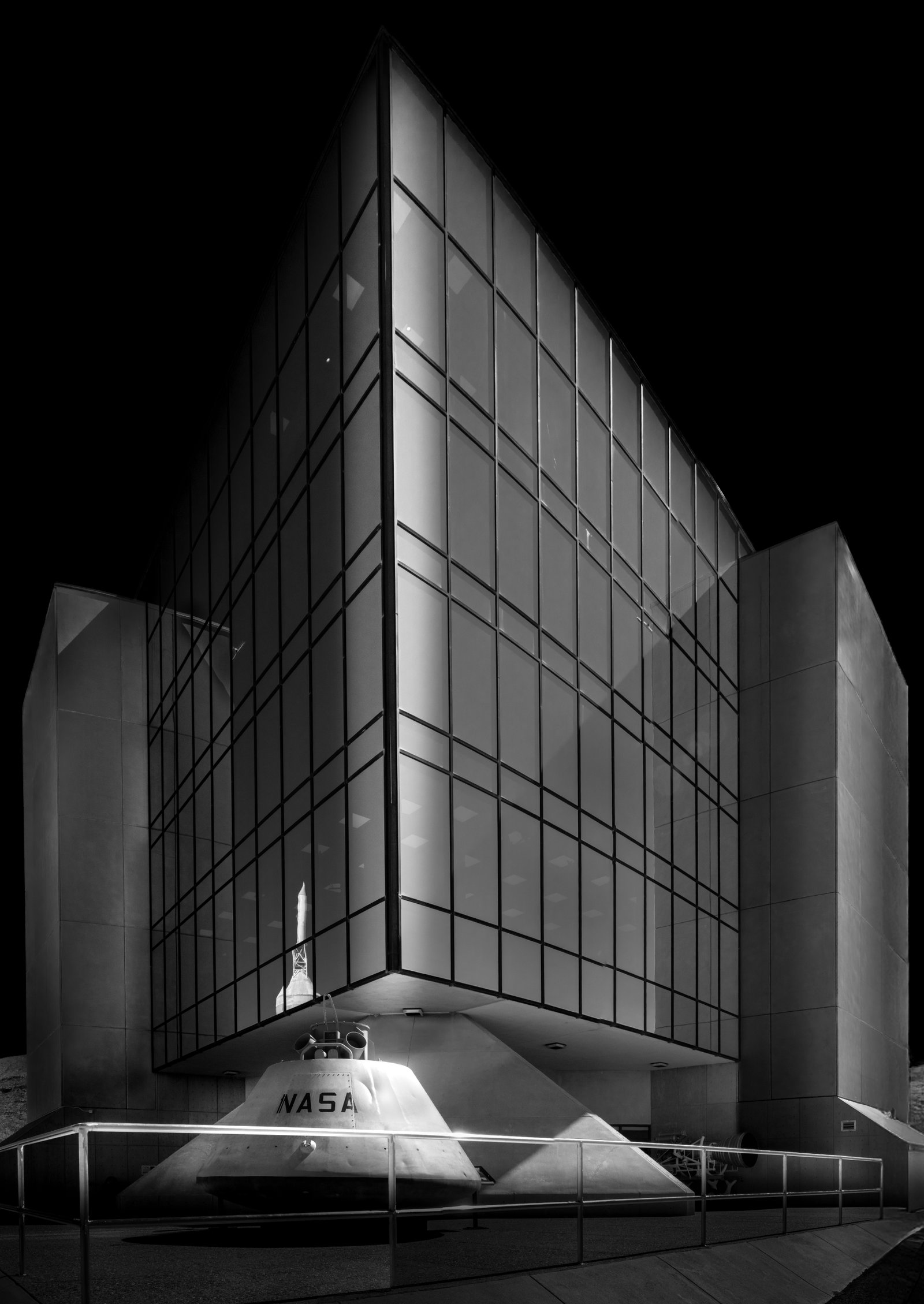 This is a B&W interpretation of The International Space Hall of Fame located in Alamogordo, New Mexico, USA. The foreground is the Apollo Command Module Boilerplate S/N 1207 that was used by NASA during the training the recovery crews for the Apollo space capsules at Patrick AFB. The reflection in the glass exterior of the Space Hall is of a Little Joe 2 rocket that was used to test the performance of the command module parachutes at White Sands Missile Range between 1963 and 1966. The International Space Hall of Fame is located in Alamogordo because of all of the testing of the rocket systems on White Sands Missile Range and with Ham and other chimpanzees that helped America successfully launch astronauts into space and then on to the Moon.