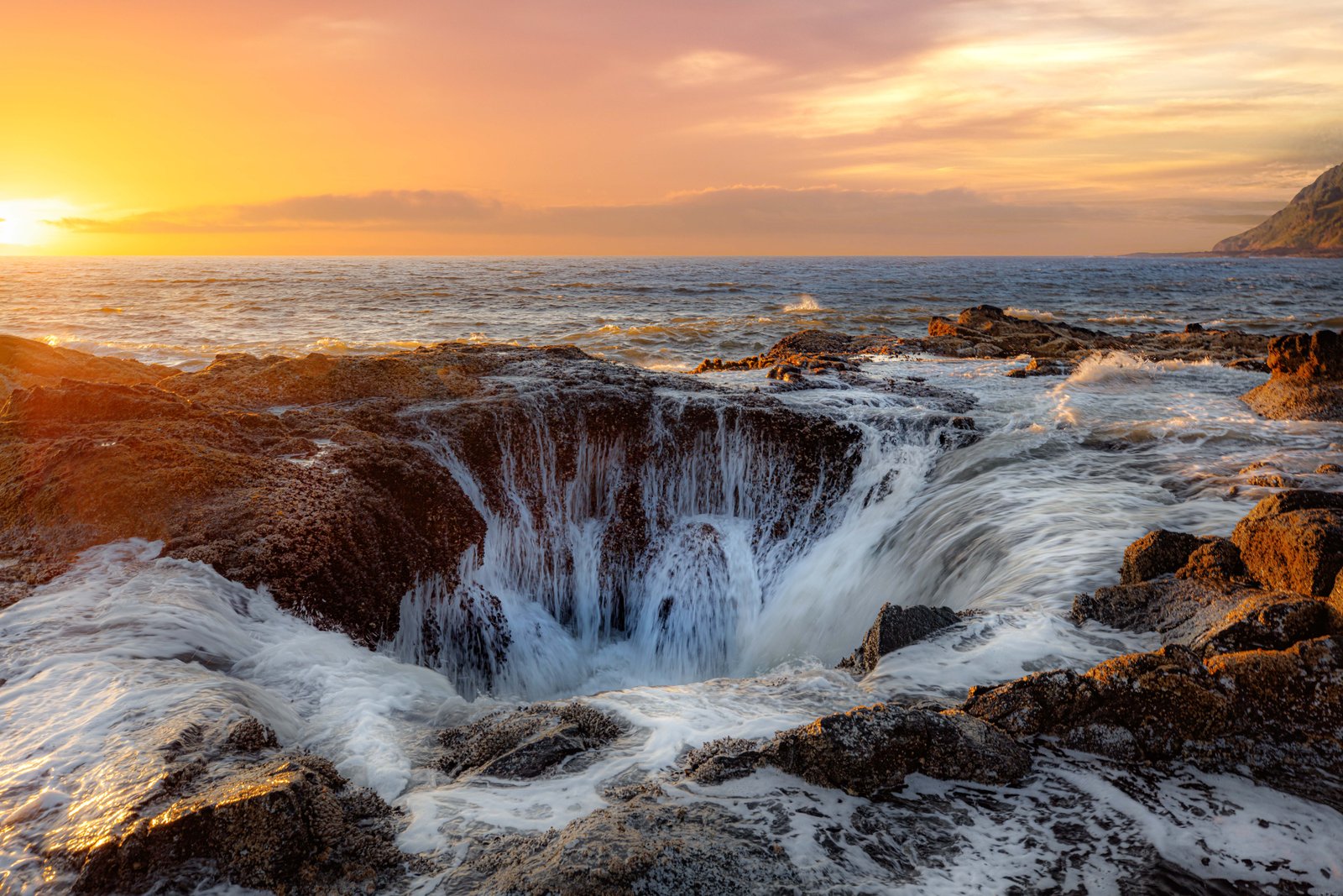 Thor’s Well is a geographic anomaly on America’s Oregon coast, a tidal pool that’s also a 20 foot deep lava tube that sucks waves below. Thor’s Well challenges the photographer in several ways: the event only happens at high tide – when tidal pools are most dangerous. Plus the light is best at sunset, which doesn’t generally align with high tide. Capturing that gaping "well" requires the photog to go wide angle and get close, to catch a moment as the wave rush in. Capturing the power of the waves was key and I shot at 1/40 sec to suggest that motion. The painterly brushwork and layering added a sense of depth, immediacy, mystery.